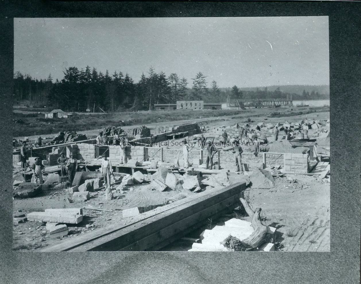 Photograph depicting the main barracks at Fort Casey under construction, c. 1903.Photograph Details