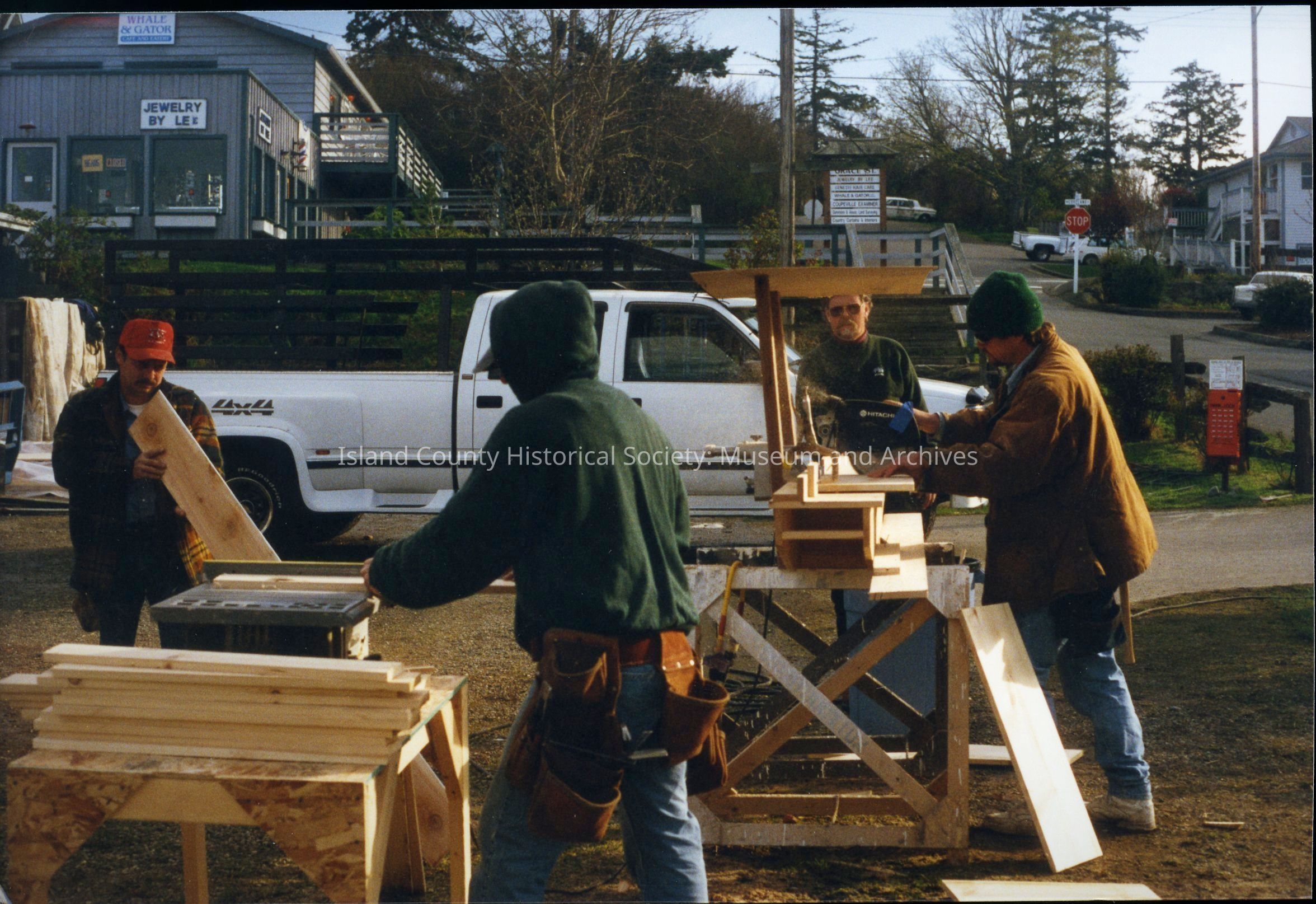 Construction workers cutting wood pieces for building facades and set of "Practical Magic" on Coupeville's Front Street, c. 1997-1998.Photograph Details