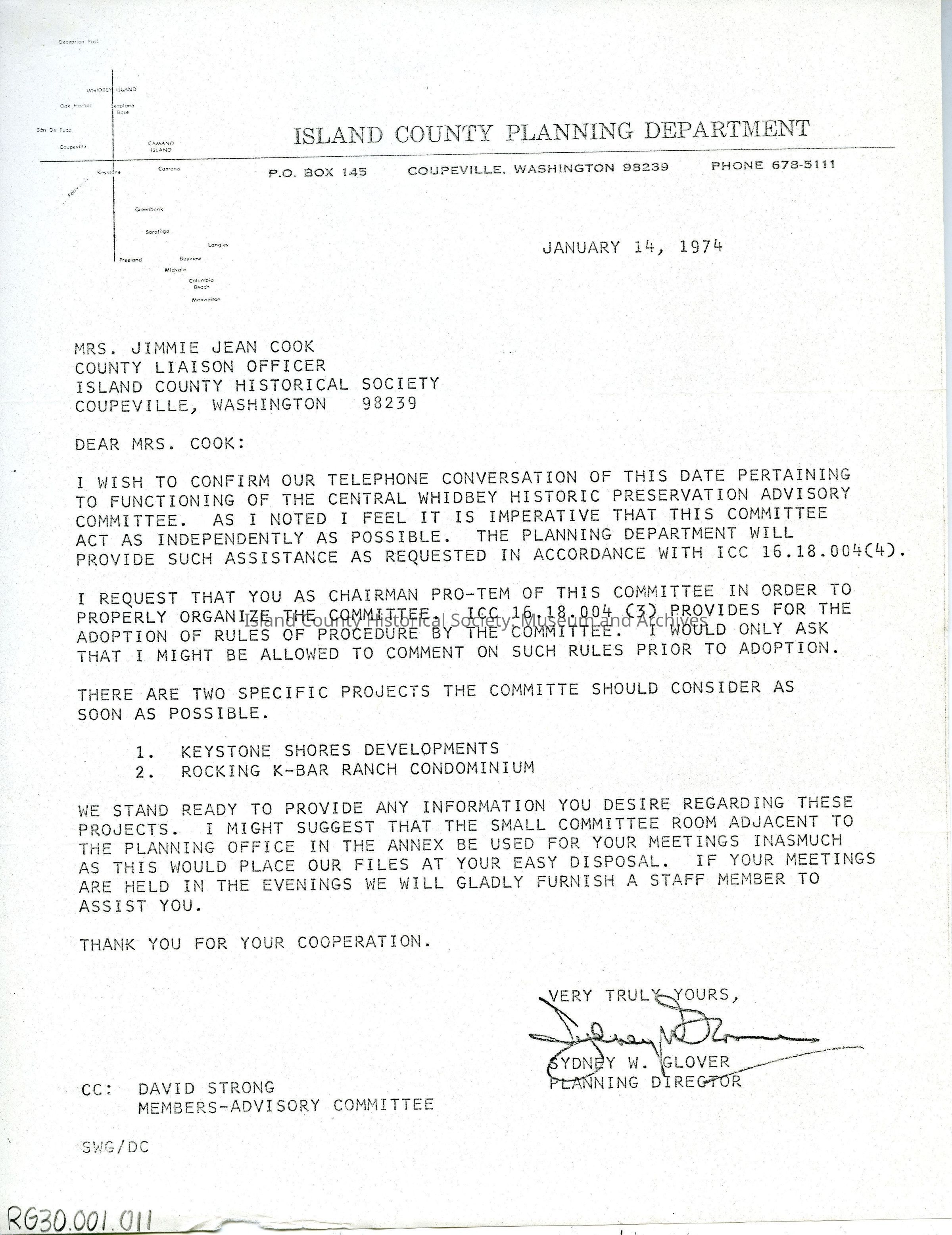 Correspondence between Jimmie Jean Cook and Sydney Glover, Island County Planning Director, regarding two projects that they committee should consider.