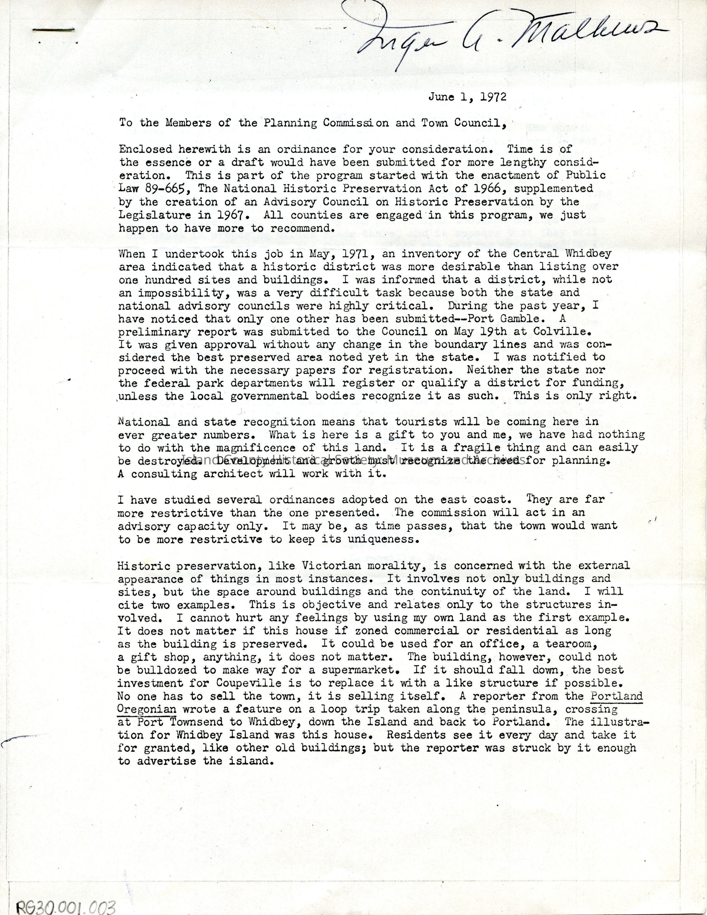 4 pages - Correspondence from Jimmie Jean Cook to the Members of the Planning Commission and Town Council regarding the historic preservation of Coupeville by enacting a Historic Zoning Ordinance.
