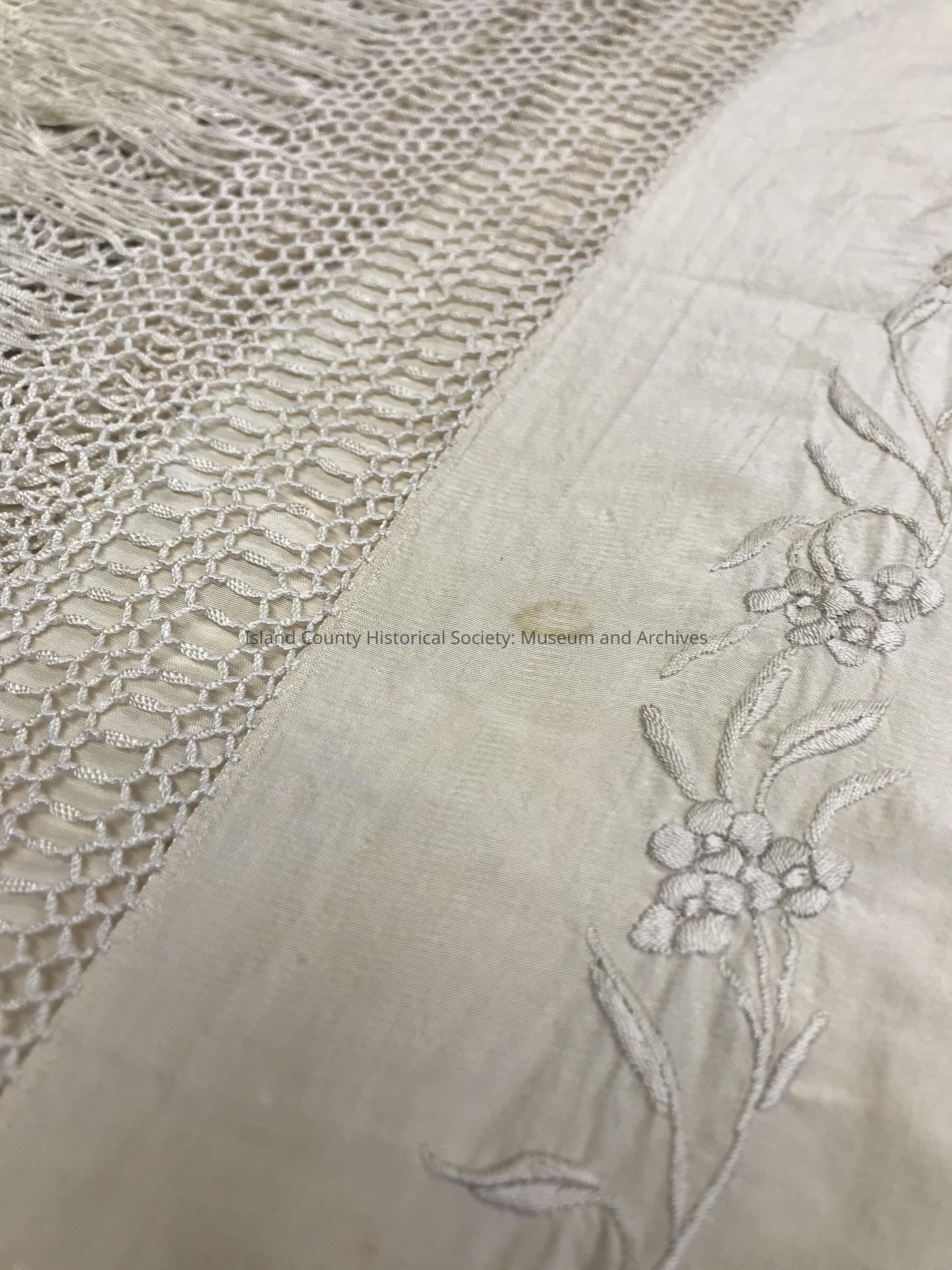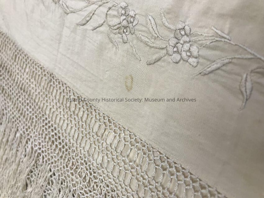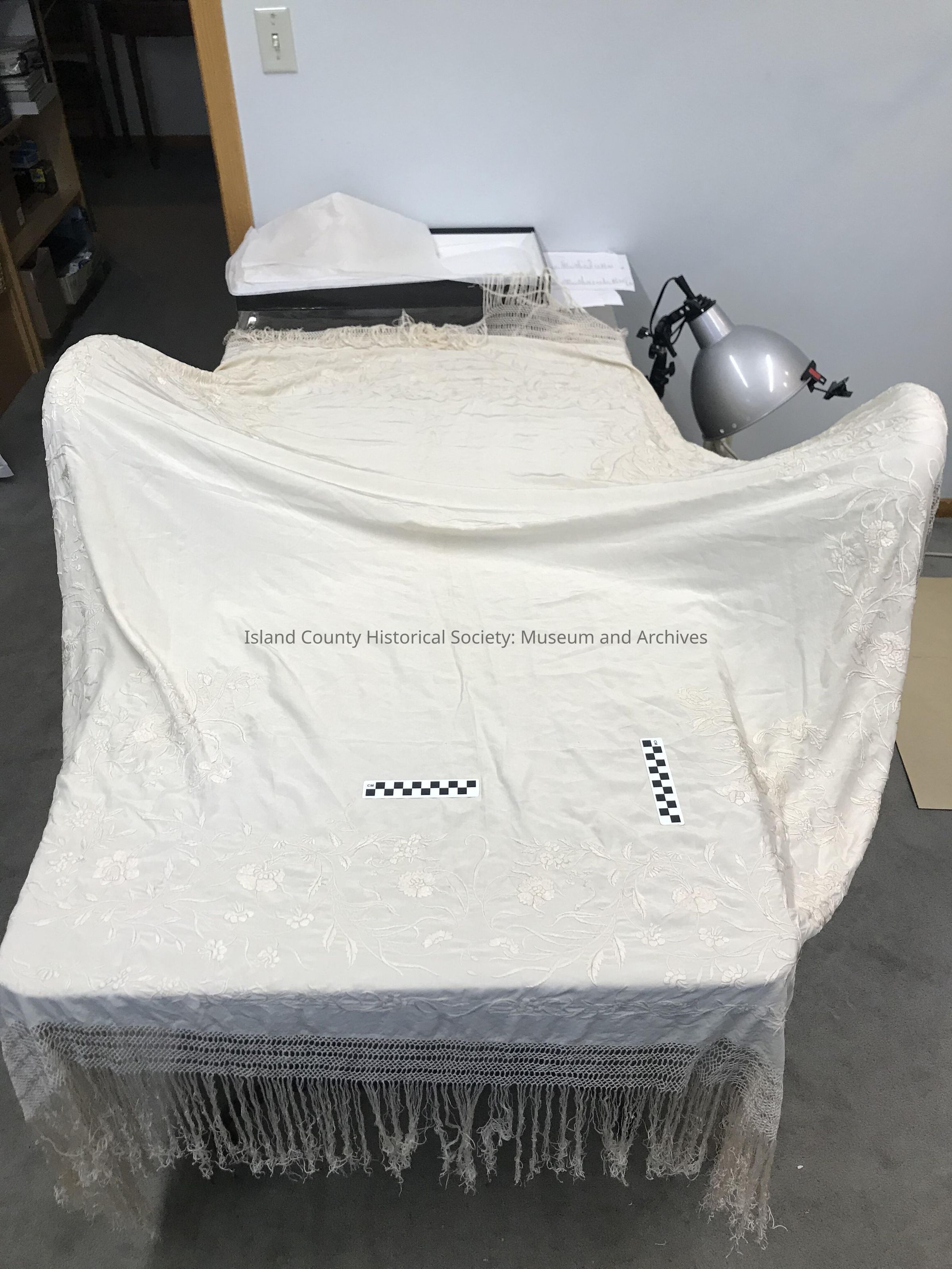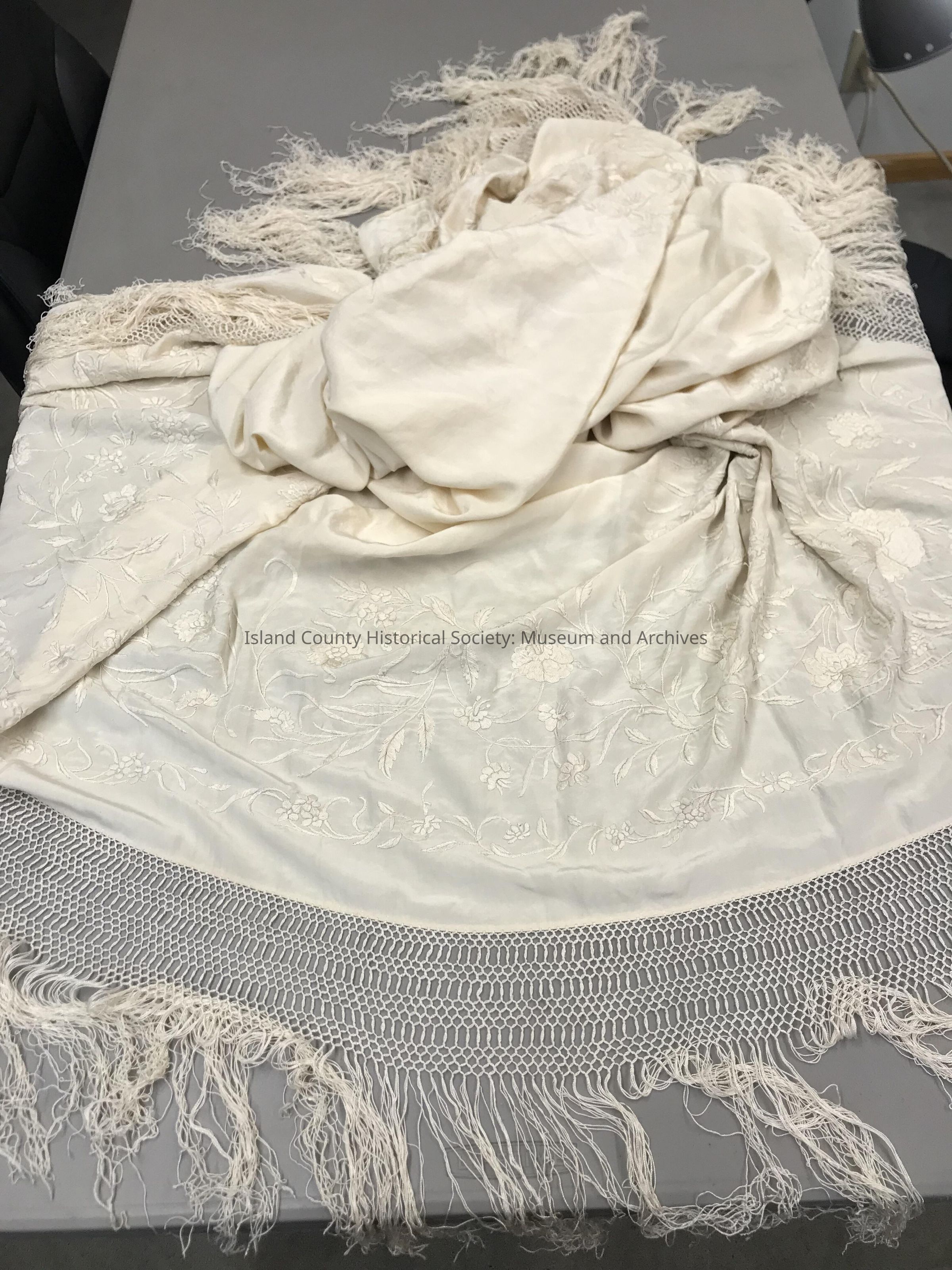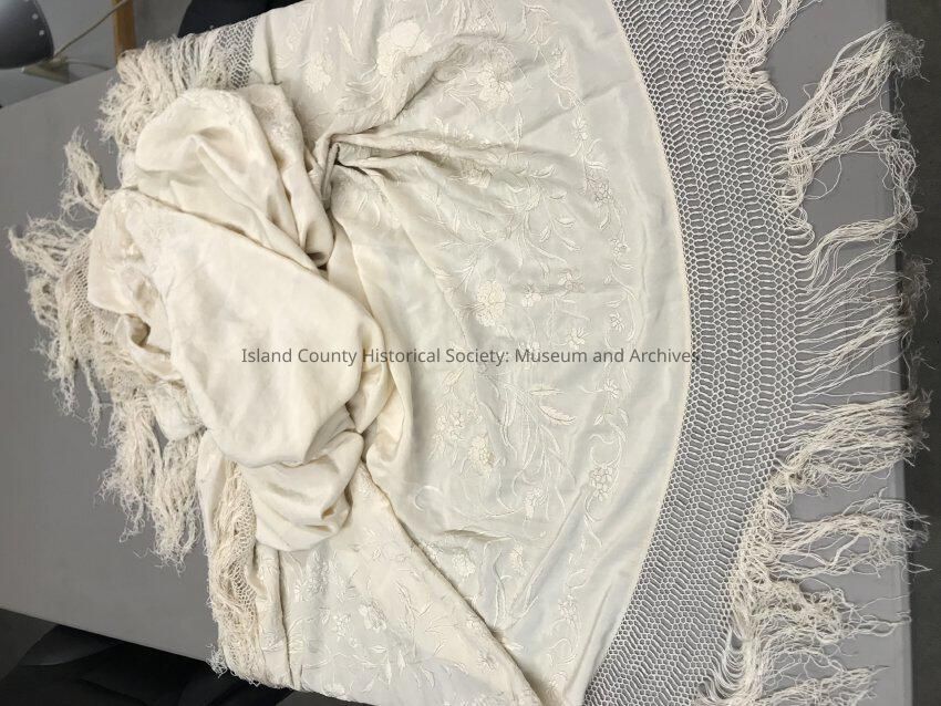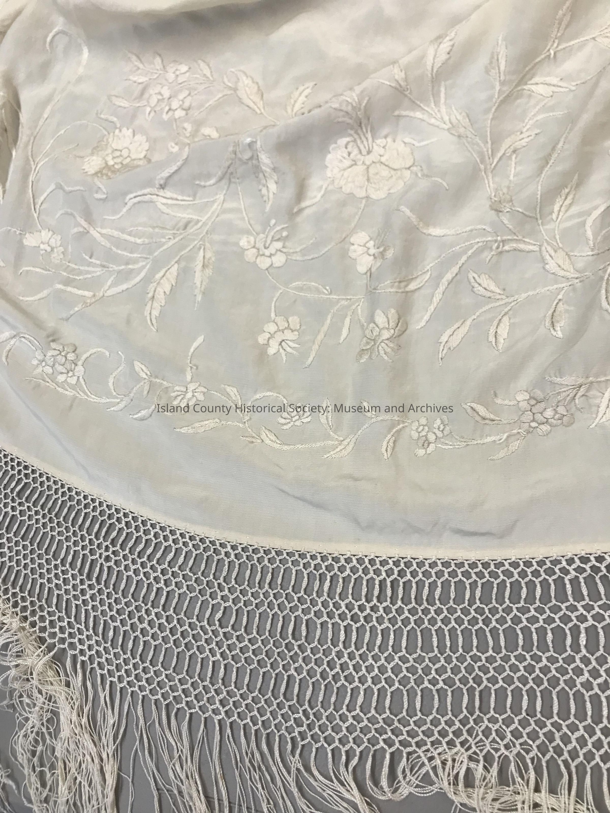 large shawl; embroidered silk; handmade by Sarah Elizabeth (1841-1894) and Maria Jane Coupe (1844-1875, Captain Thomas Coupe's daughter) on journey from England to U.S.; ca. 1860s