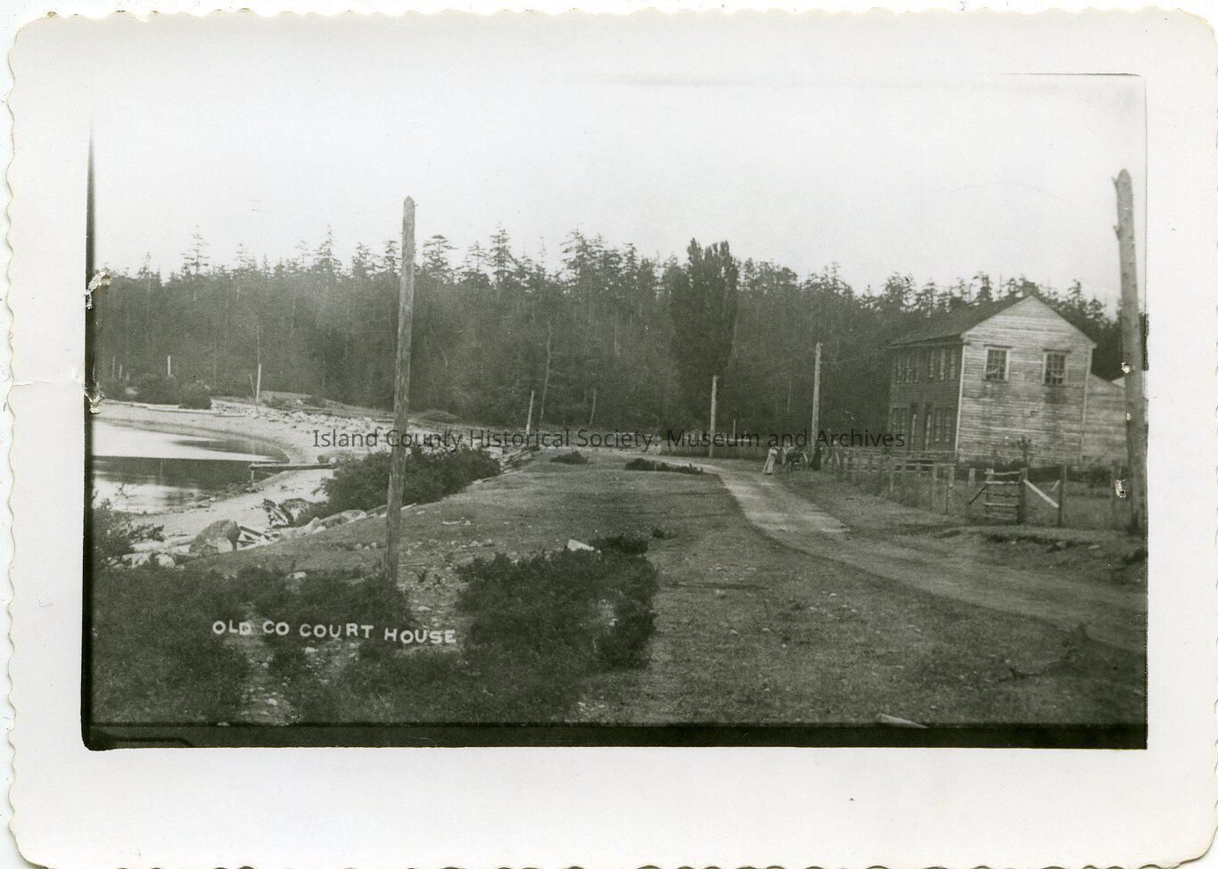 Photo of the old courthouse in Coupeville, on Madrona Way. It is on the right, wood sides, two stories. Fence in front. Dirt road. Some people standing in front of the building.