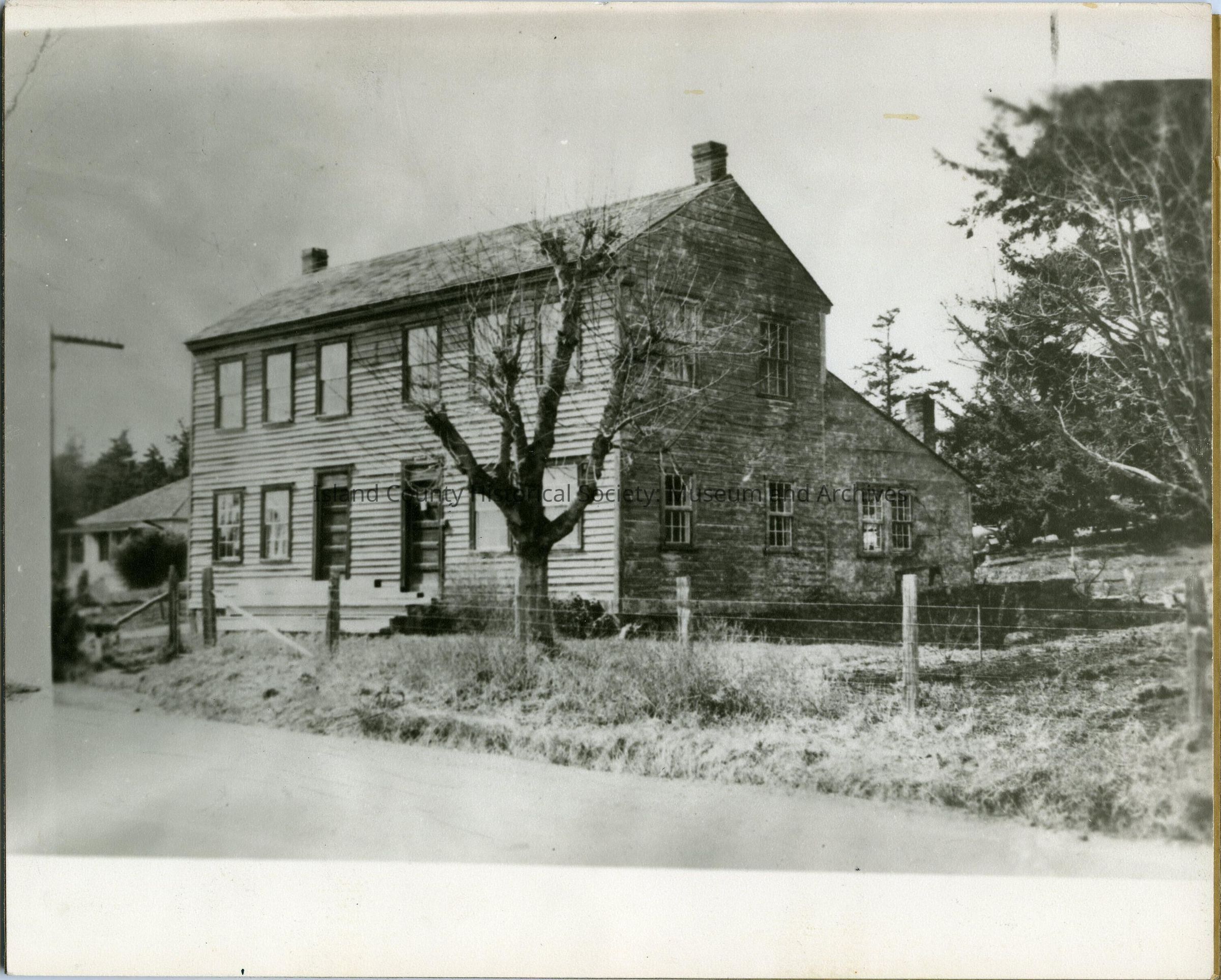 Photo of the old courthouse in Coupeville, on Madrona Way. It is has wood sides, two stories, two chimneys - one each end. Fence in front. Dirt road. Some people standing in front of the building.