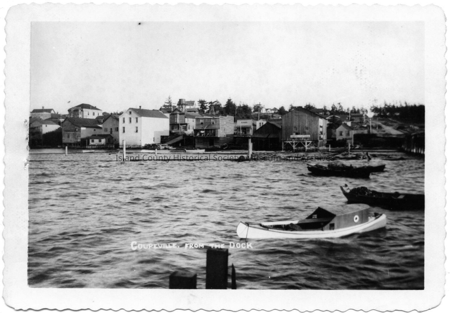 Black and white photograph. Front Street alongside one of the wharfs. A water tower is in the background. Along the shore: GIllespie Meat Market and Livery. Glenwood Hotel building. In foreground: a covered canoe and at least four other rowboats or modified canoes.