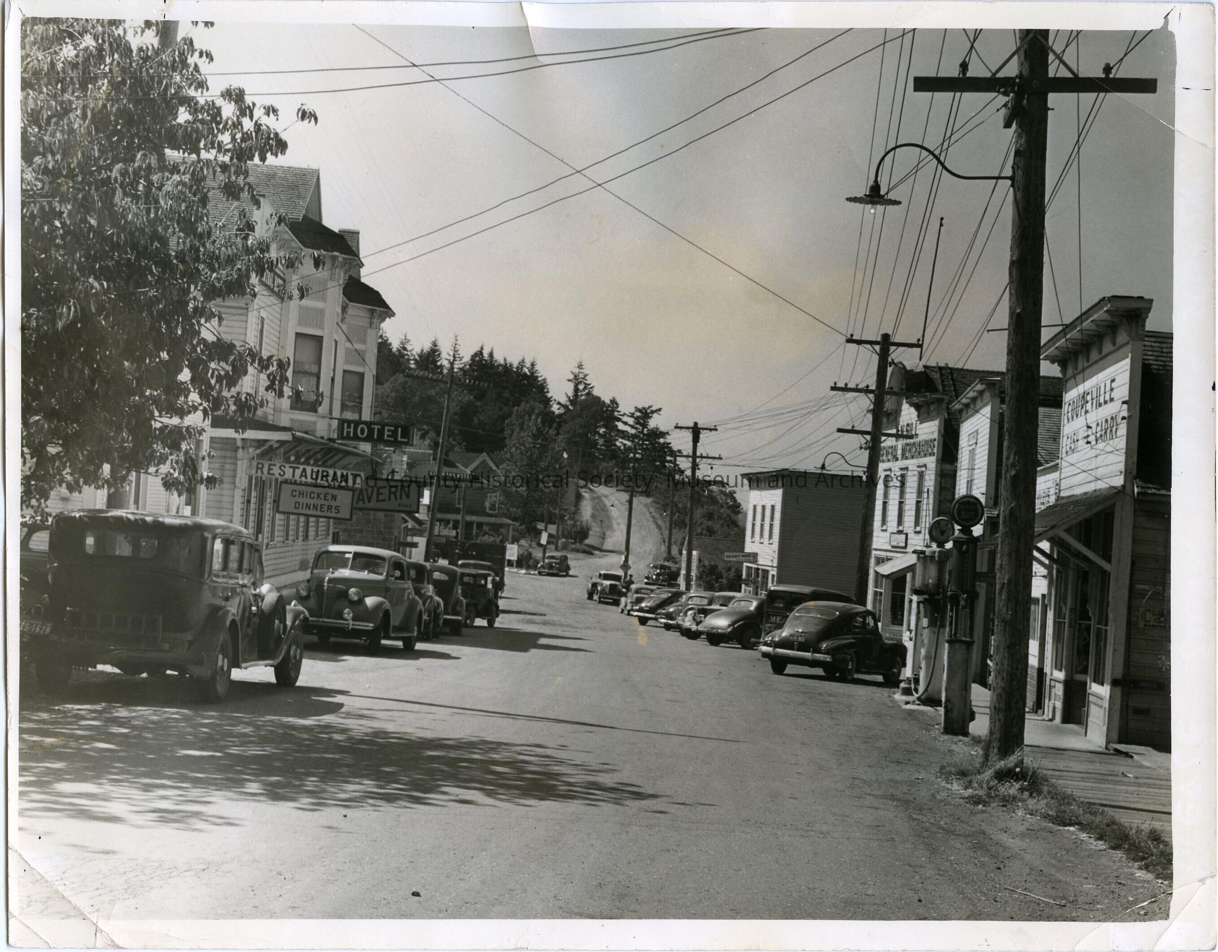 Photo of Front Street looking west; the dirt road of Front Street leads up the hill; now a path. On the left is the Glenwood Hotel. On the right is the Cash and Carry (now Toby's Tavern) with two gas pumps. Also on the right: L. N. Sill General Merchandise and in the distance the Starwana Hotel. Might still be a dirt road. On the back is a tiny newspaper clipping: This view of the main street in Coupeville indicates the inadequacy of this bustling town to furnish entertainment for a garrison of soldier. Stamped Aug 16, 1941.