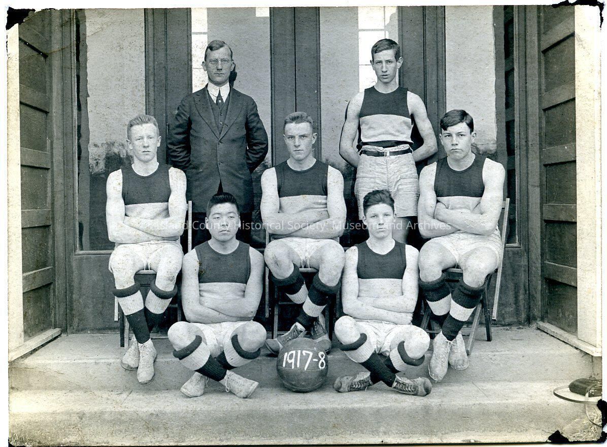Picture of Amer. football team of Coupeville High School 1917-8. In football gear with teacher on school steps(?). Three are in chairs, two on the steps, teacher and one player stand at the back. Smaller version of .004aMade/Created
