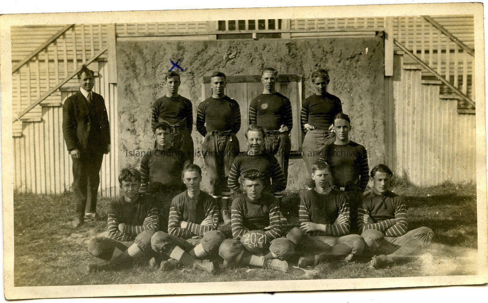 Picture of basketball team of Coupeville High School. 1920-1. x over head is Charles Lyon Jr. Standing or sitting in their gear with teacher on left side. Staircase either side of them in the background.Made/Created