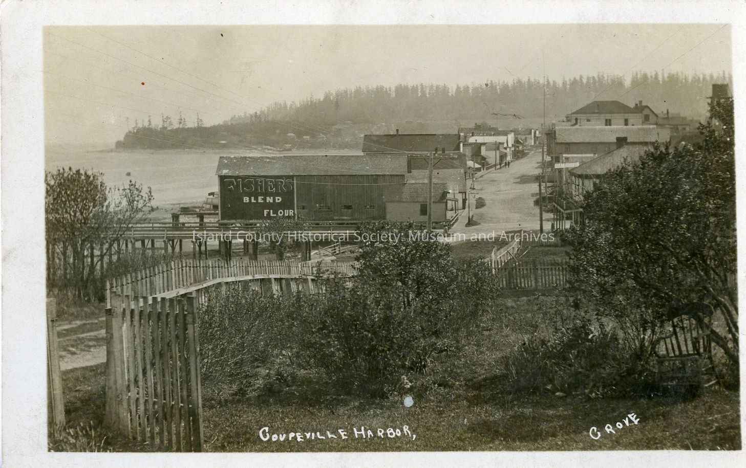 Postcard depicting a view of Coupeville's Front Street and a portion of the Wharf, looking East from near where the Island County Historical Museum is now. Possibly c. 1910-1920. Photo by Perry Grove.Collection
