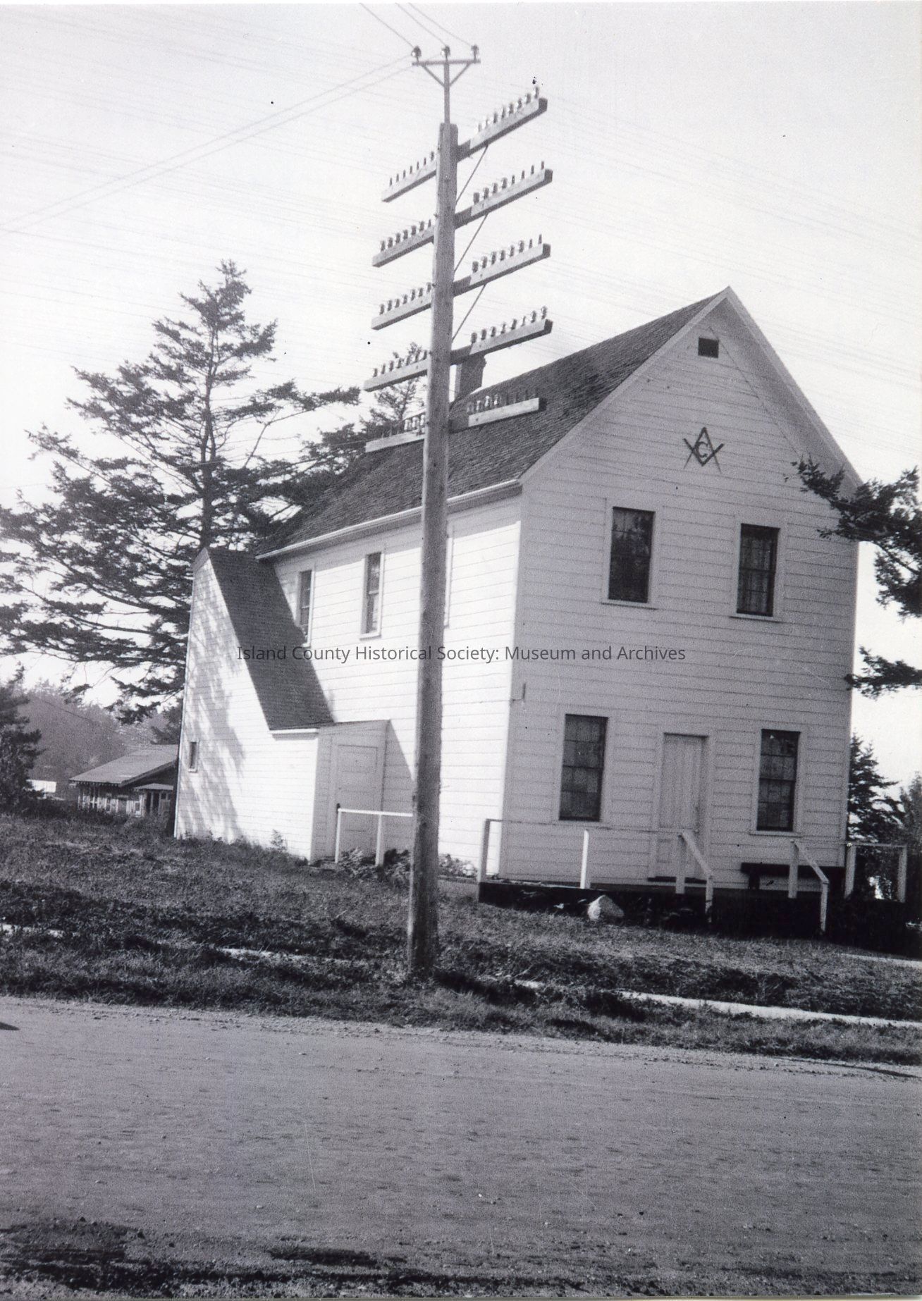 Photograph of the Masonic Lodge in Coupeville, prior to its addition with columns added on the east end. John S. Alexander, son of John and Frances Alexander, built the building. A handwritten note from Roger Sherman on the Reverse says "He [John S. Alexander] called it the Masonic Temple but did not say when it was built. Said he was master of the Masonic Temple for years."
