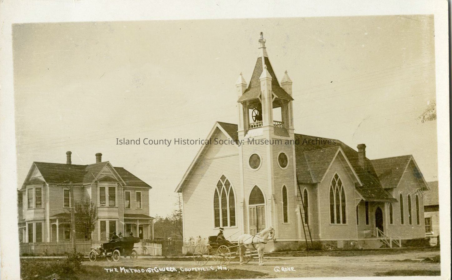 Postcard depicting Coupeville's United Methodist Church, likely c. 1910-1920. An early car (left foreground) is visible, contrasted with a horse and buggy (right foreground). Photo by Perry Grove.Collection