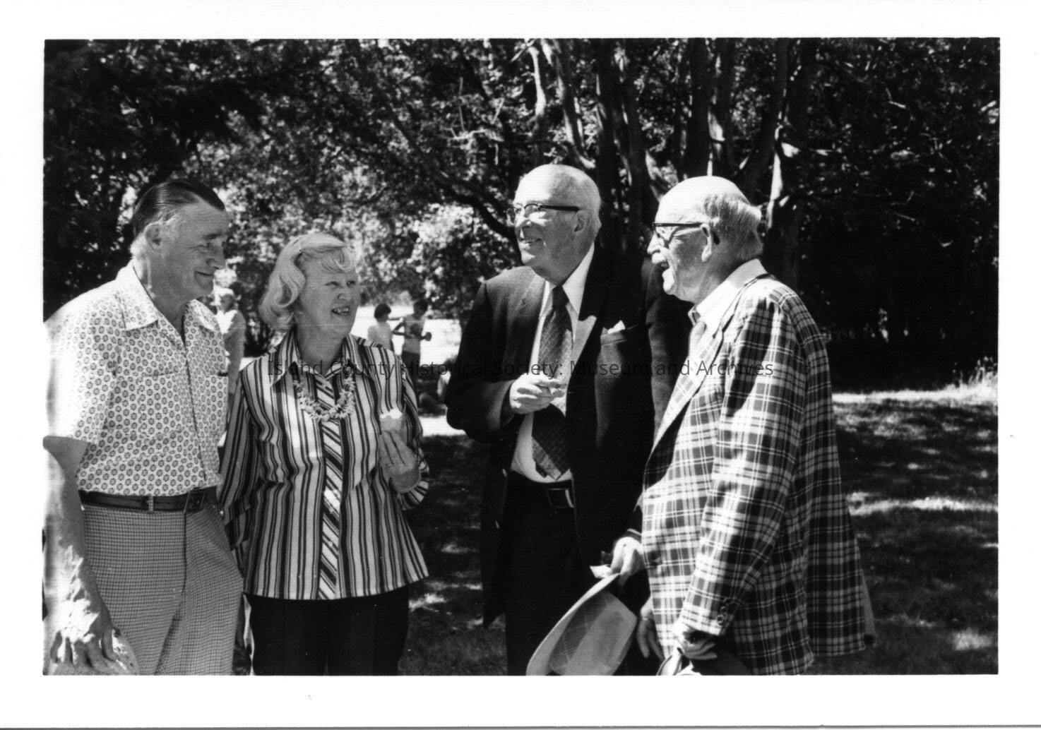 Group of people at Coupeville Old Timers Picnic in 1968. The group is made up mostly of decendants of the pioneers to the island. This group of four are standing together under a tree.