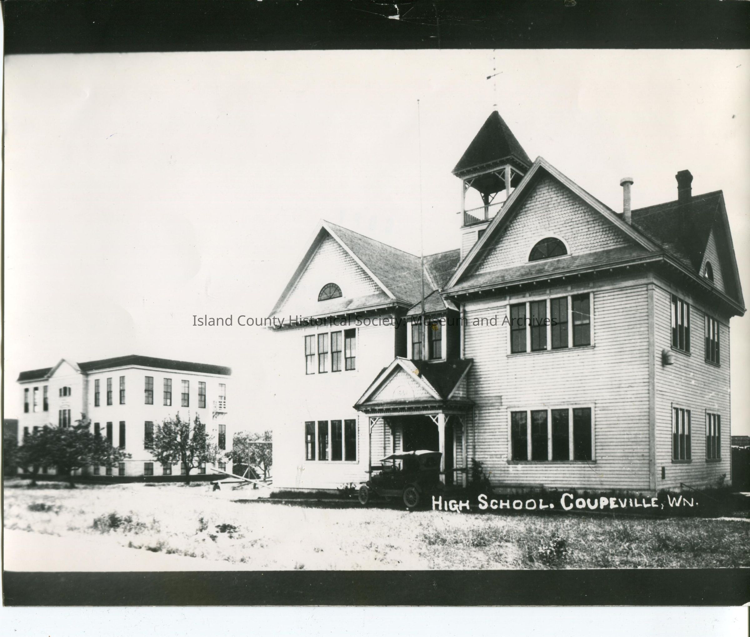 A photo of the old Coupeville school with a large white building beside it Printed on the front "High School, Coupeville Wn"