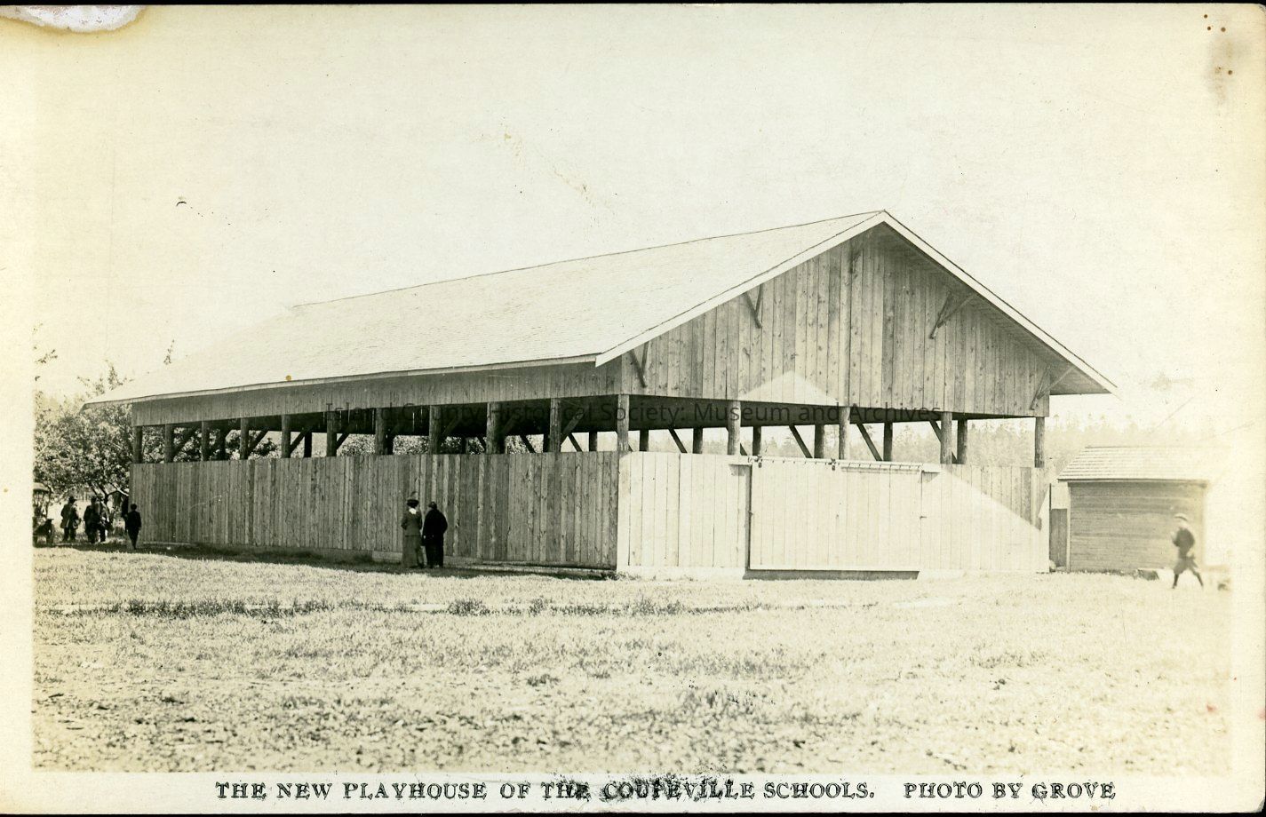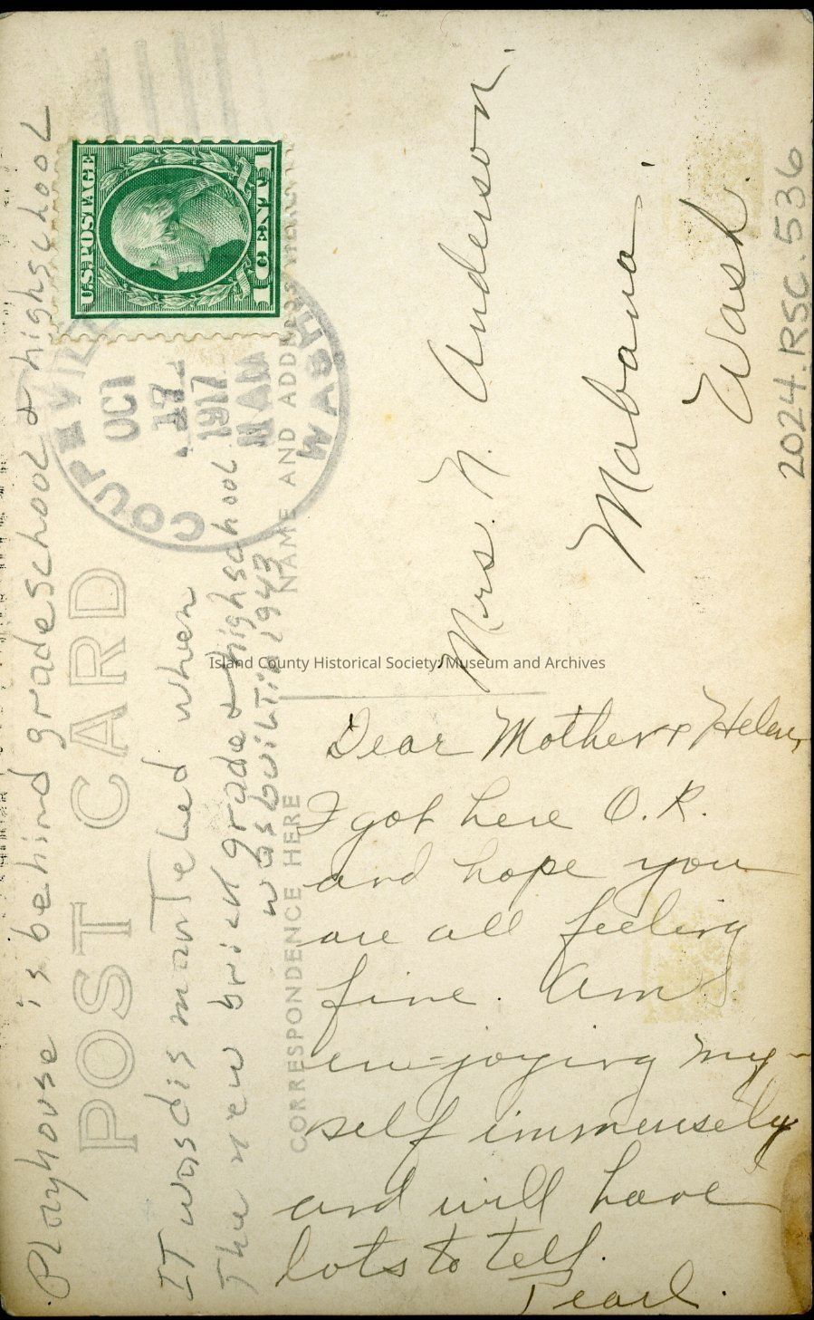 Postcard depicting the playhouse for Coupeville schools. This was located behind the Coupeville grade school and was dismantled when the new brick grade school and high school were built in 1943. Postcard addressed to Mrs. N. Anderson of Mabana, Washington (Island County). The reverse of the postcard reads, "Dear Mother & Helen, I got here O.K. and hope you are all feeling fine. Am enjoying myself immensely and will have lots to tell. Teail" [or Jean -- unclear]. Postmarked 17 October 1917.Collection