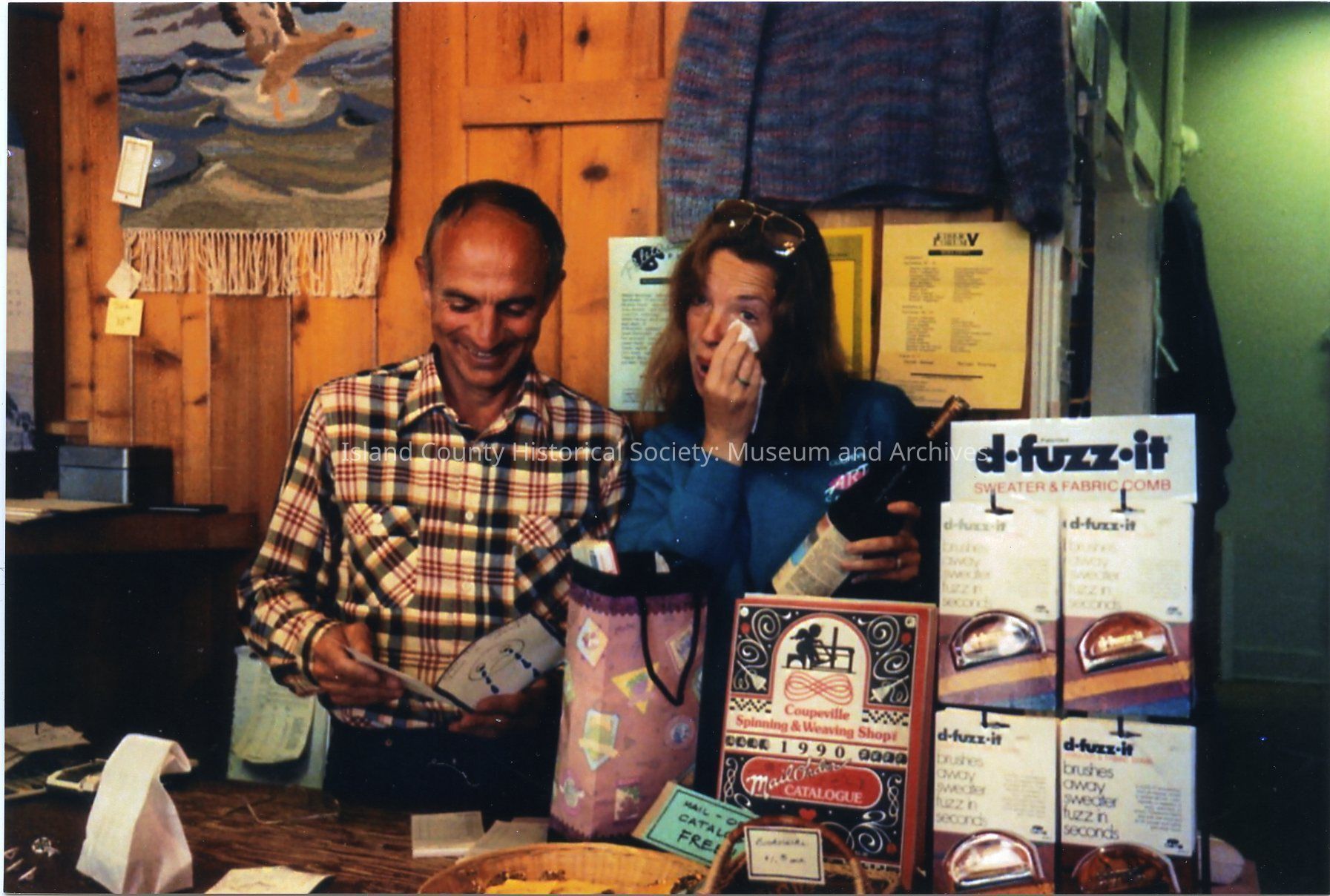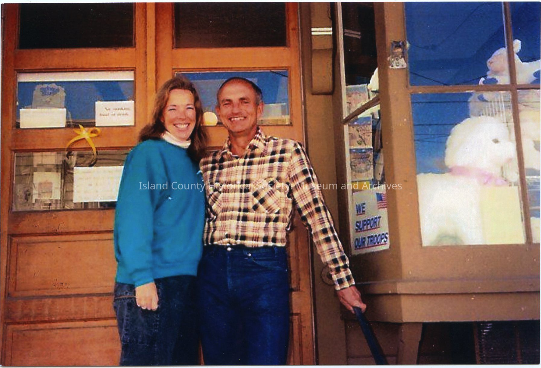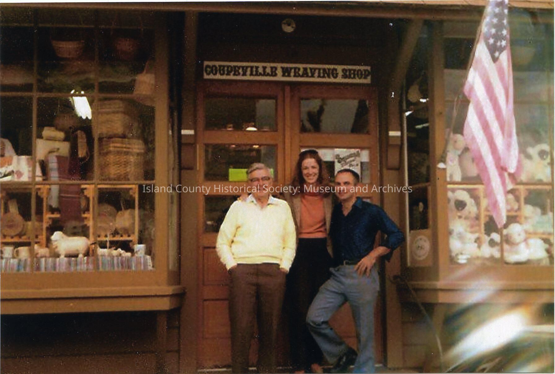 Photo of Lee and Jim Anderst, owners of the Coupeville Spinning and Weaving Shop. Two men and a woman (young couple are the Andersts) are standing on the steps of a shop with double doors, and two bay windows. An American flag is on the right. A variety of items are in the windows - including soft toy lambs or sheep.