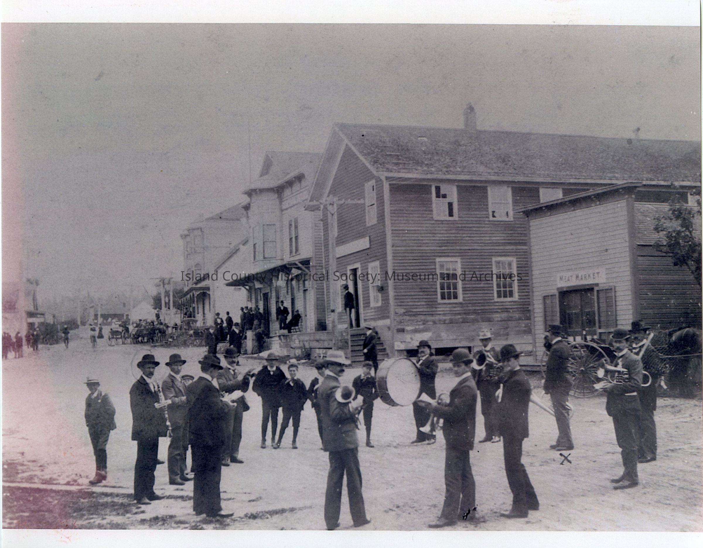 Photograph of the Coupeville town band playing on Front Street, Coupeville, c. 1880s-1890s. Note on reverse of photo credits "De Ja Views by Dorothy Neil."Photograph Details