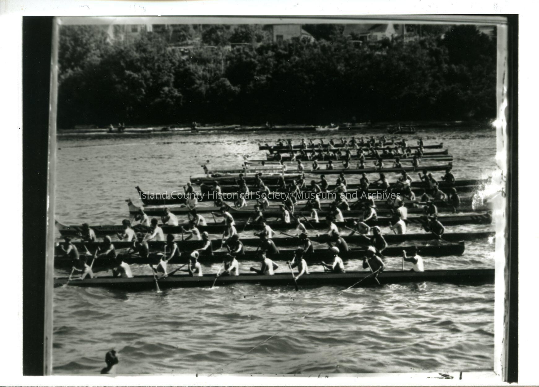Native American canoe paddlers - 11 men each in at least 14 canoes during the Coupeville Water Festival canoe races.