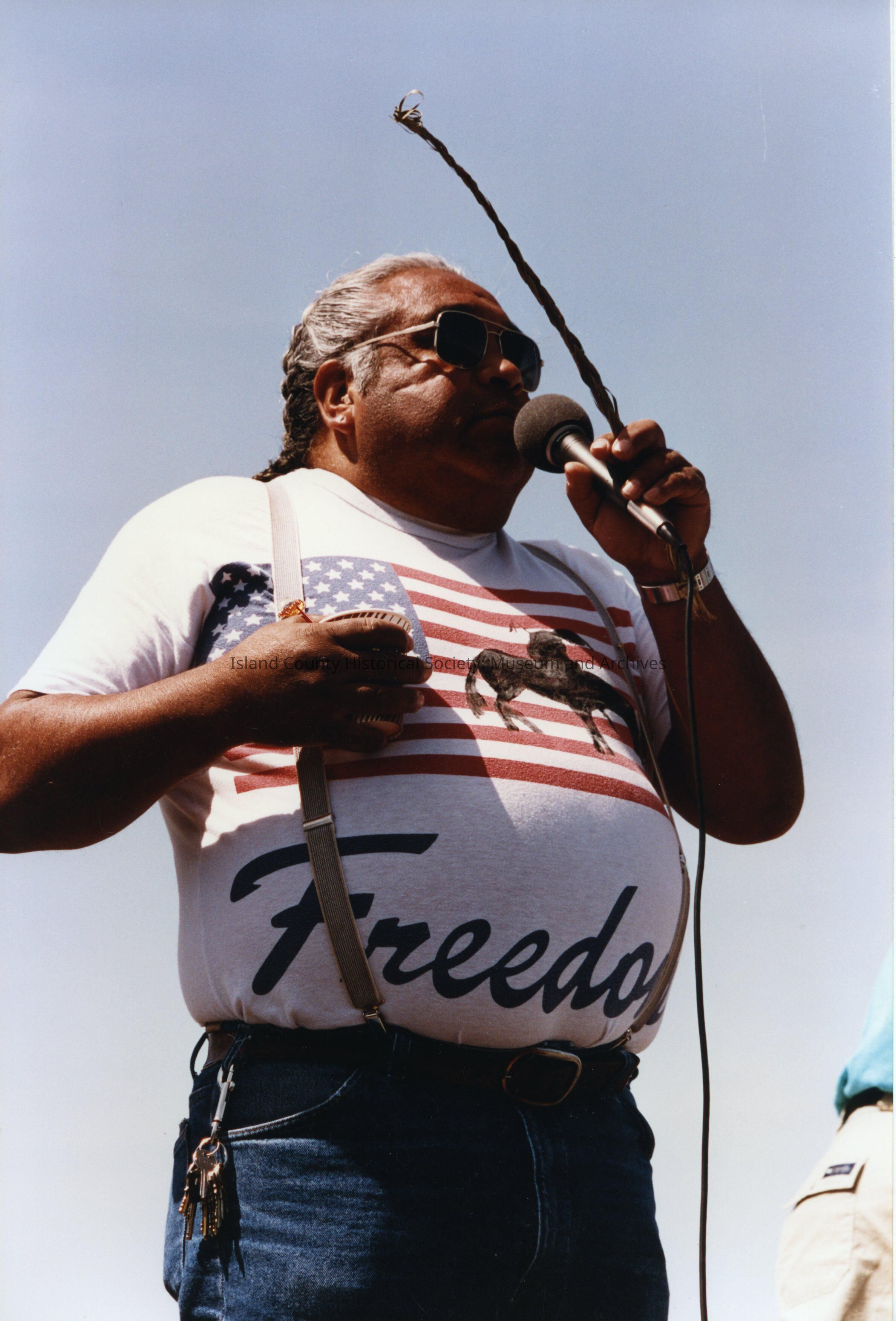 Coupeville Water Festival, year unknown. Color photo. A closeup of Lummi man, Jim Hillaire, with graying hair worn in a braid. He is speaking into a microphone. He is wearing jeans, suspenders, and a t-shirt imprinted with the American flag, a horse, and the word "Freedom".Photograph Details
