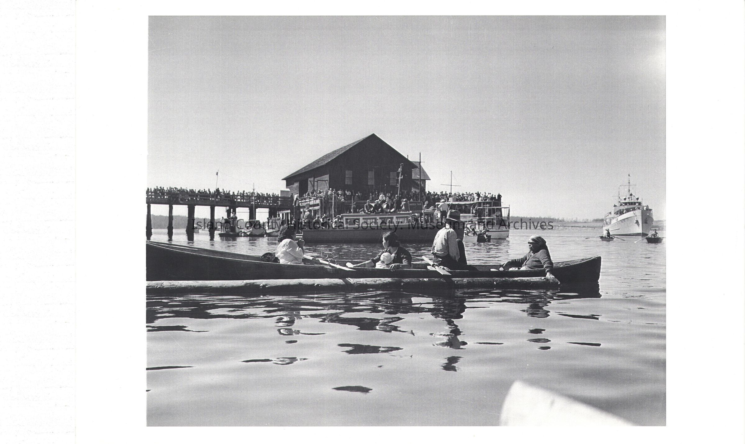 Black and White Photo of people in large canoes taken from a water vantage pointPhotograph Details