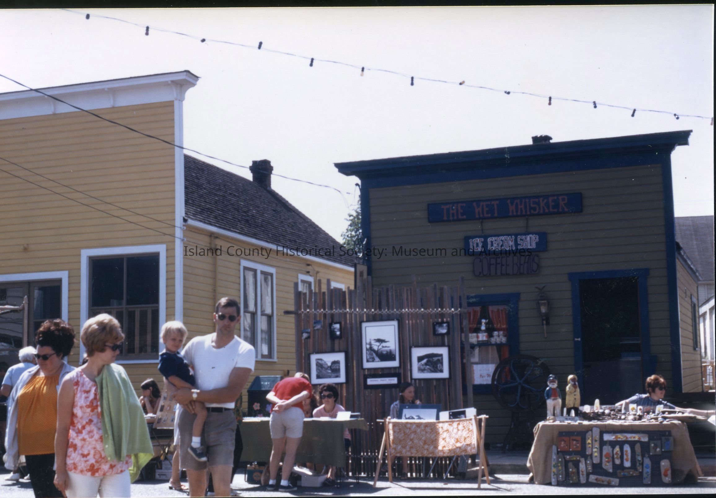 Coupeville's Front Street with market stalls/vendors during a Penn Cove Water Festival or Arts & Crafts Festival, c. 1969-1970s (The Wet Whisker at #21 NE Front Street opened in 1969). #21 NE Front Street and #19 NE Front Street are visible in the background.Photograph Details