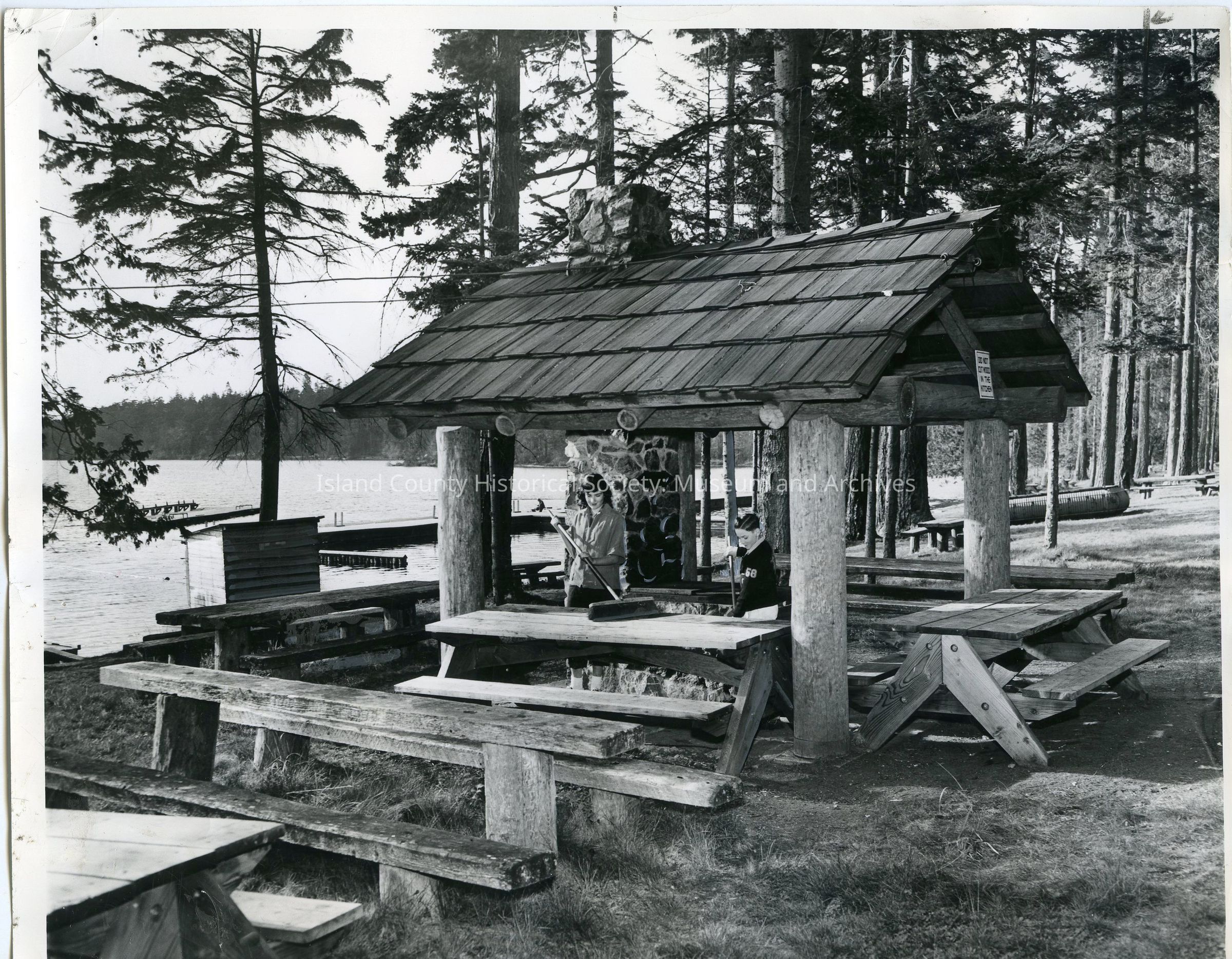 Mary Hudson and Roger Christensen, children of park officials at Cranberry State Park, tidied up an outdoor kitchen in the park, one of the state's most spectacular recreation areas. The lake was visible through the tall virgin timber. The park is at Whidbey's northern tip, near Deception Pass.Photograph Details