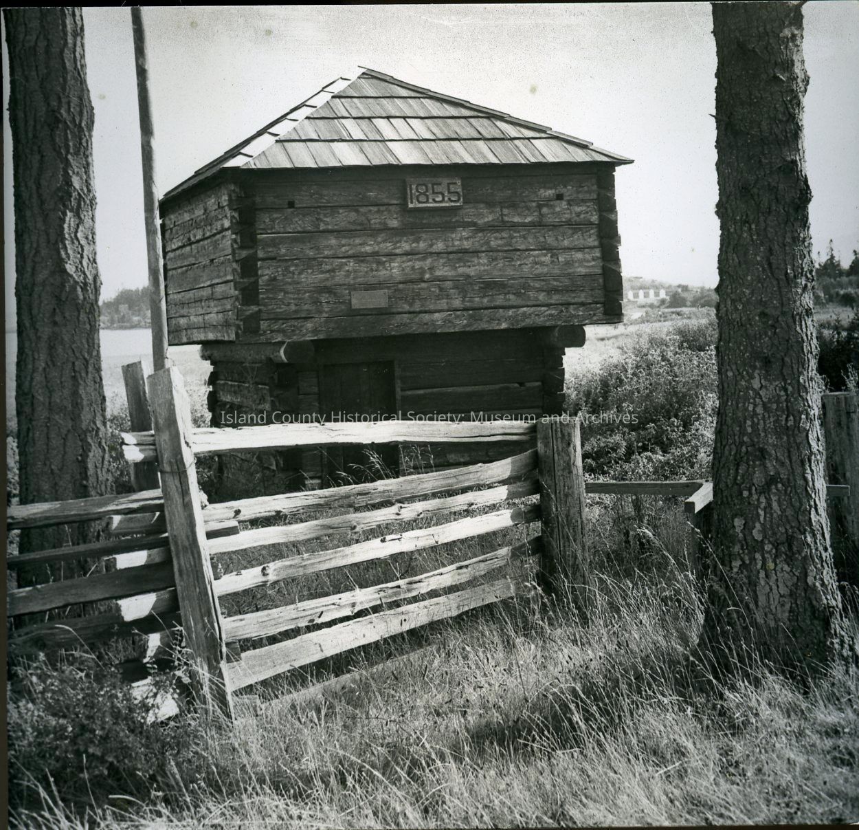 Photograph of Crockett Blockhouse, built in 1855. The blockhouse was restored in 1938 and moved to its present site on Fort Casey Rd.