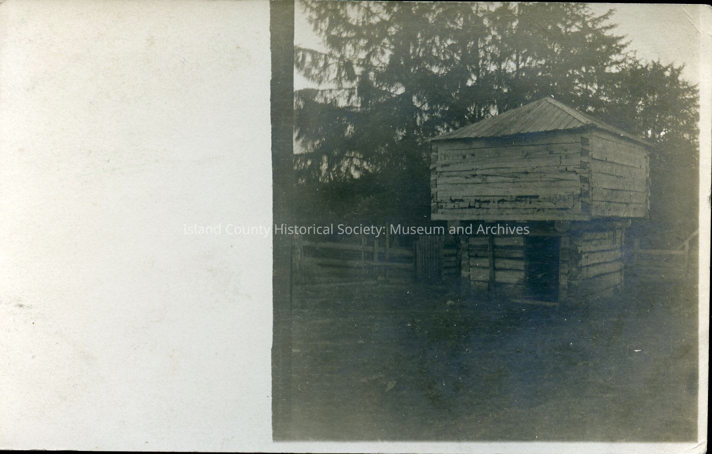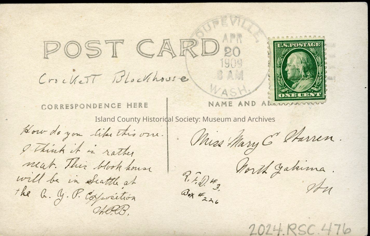 Postcard depicting Crockett Blockhouse, postmarked 20 April 1909. Addressed to Miss Mary E Warren, R.F.D. #3, Box #226, North Yakima WA. Reverse of postcard reads, "How do you like this one. I think it is rather neat. This blockhouse will be in Seattle at the A.Y.P. Exposition. H.P.B."