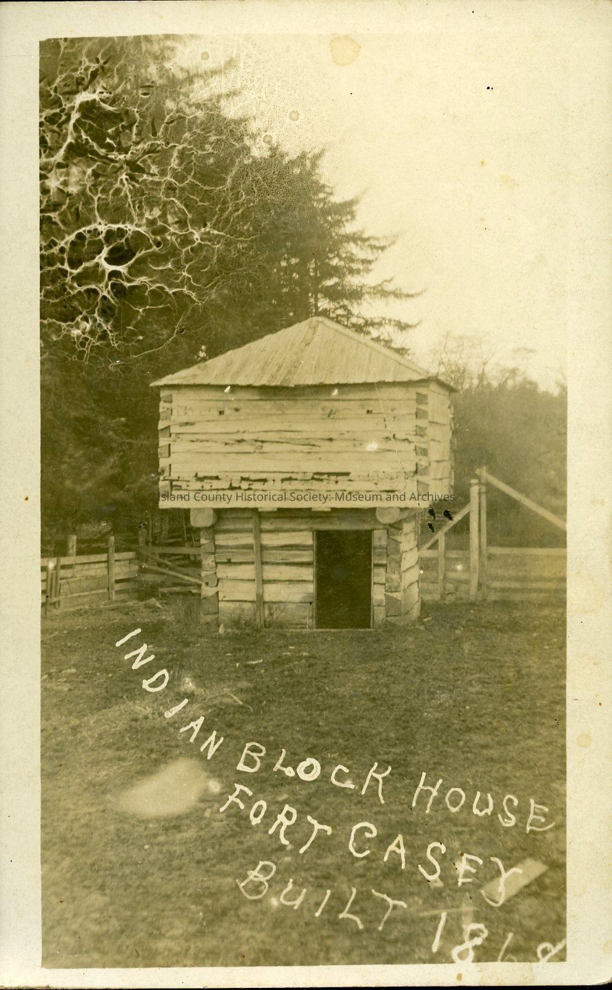 Postcard depicting Crockett Blockhouse. The description on the postcard's front is inaccurate; Crockett Blockhouse was built in 1855.