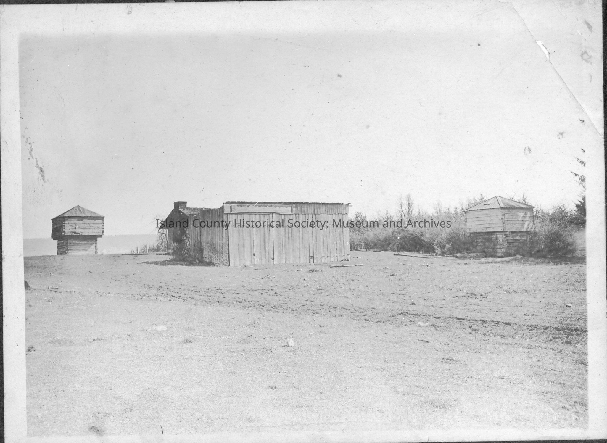 sepia photo of two blockhouses at Crockett farm, barn and house are in middle frame - framed in simple black wood framePhotograph Details