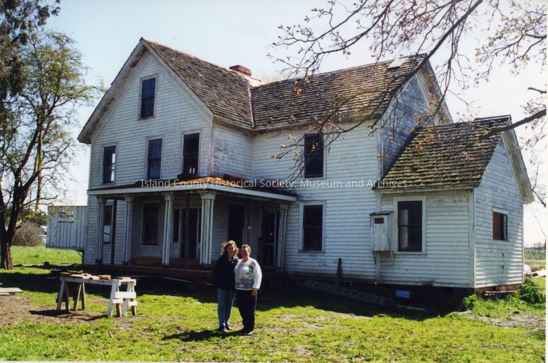 John. M Crockett built this large farmhouse in 1858 on a 318 acre Donation Claim which he filed on March 6, 1866. After his death, his wife Ann remarried Dr. Joshua Highwarden. They resided here until they sold to Thomas W. Calhoun in February 1888. Calhoun remained until 1889 when he sold to Charles (Carl) Engle. Charles Engle built the gambrel-roofed barn adjacent to the house in 1909, as well as the milk barn, grainery and machine outbuildings. In 1916, Engle constructed the large stone gate posts using woven wire fencing. He also constructed the cement sewage trough running from the house into the field. A new roof was put on in 1950. The ownership moved Charles Engle to his daughters, and then to their brother Robert E. Engle who is the current owner. Robert re-roofed in 1980.