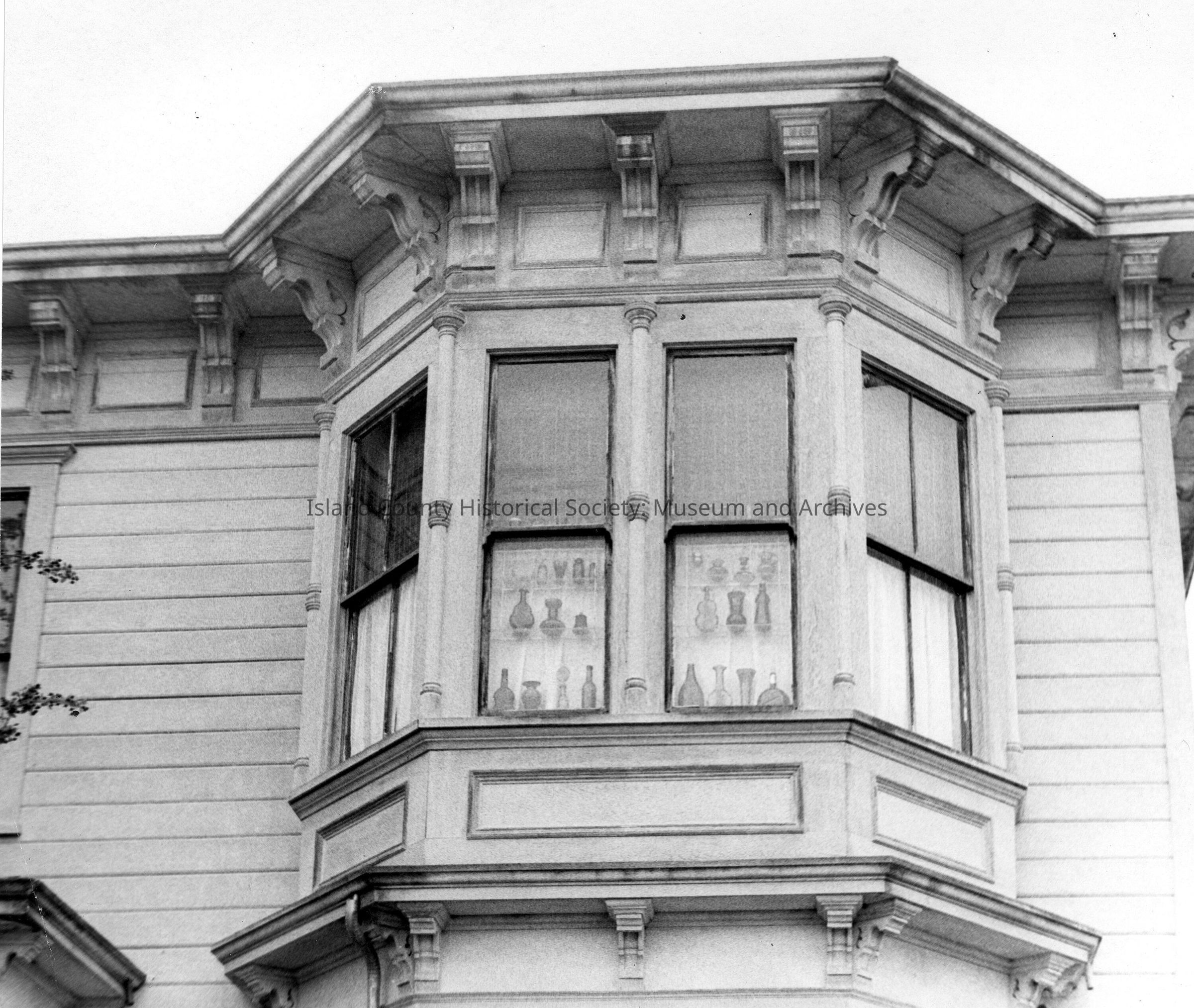 b/w photo of the blue bottles in the Kinneth House