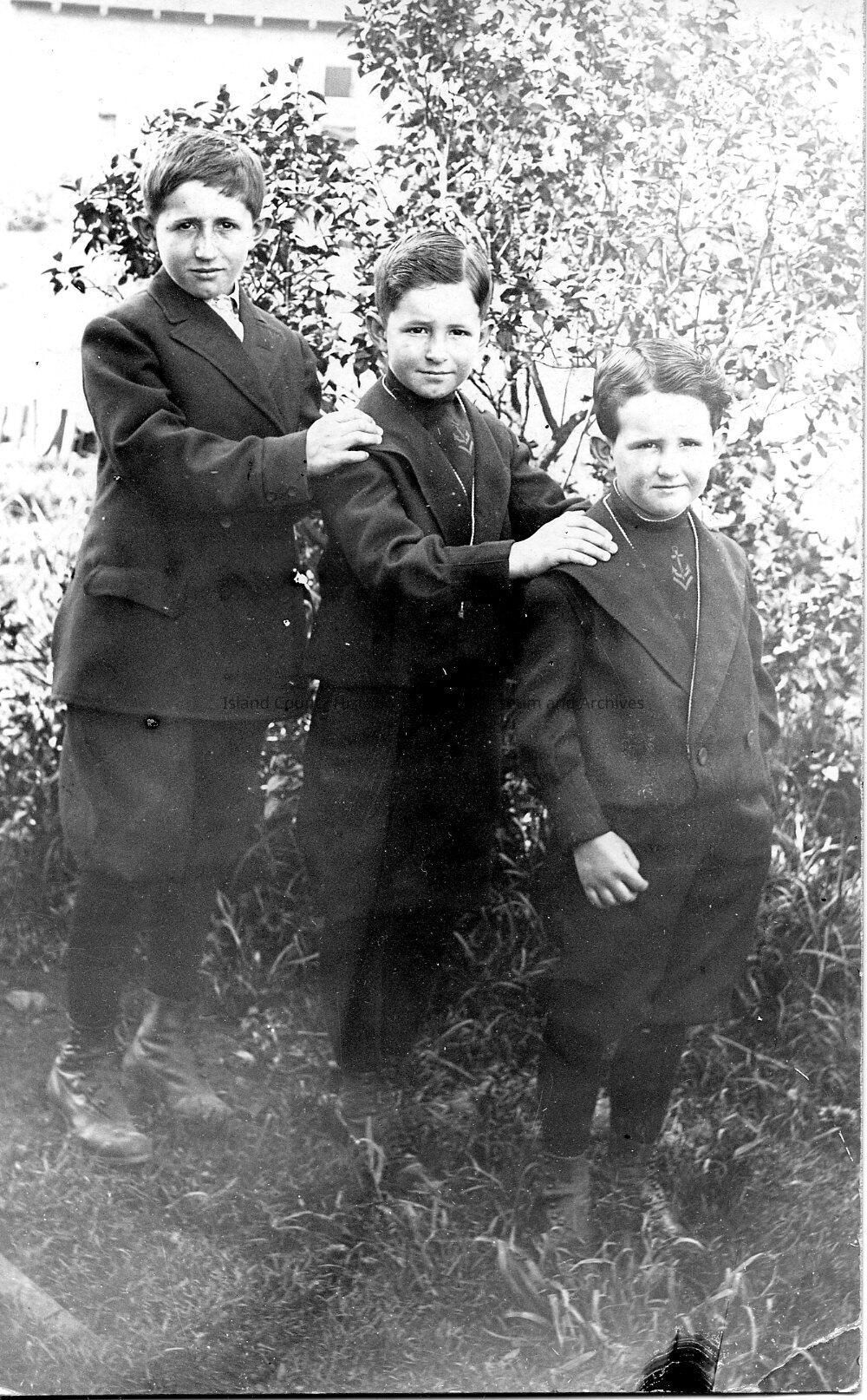 Postcard of three boys in uniforms, arranged tallest to shortest, each with their hand on their younger brother's shoulder. The boys have dark hair and fair skin. The back of the postcard reads George Warren Melorn Neil, and is addressed to Mr. Eddie Kennedy, Coupeville Wash. There is a post stamp from the town of Oak Harbor on the back as well, dated May 17 1911.Collection
