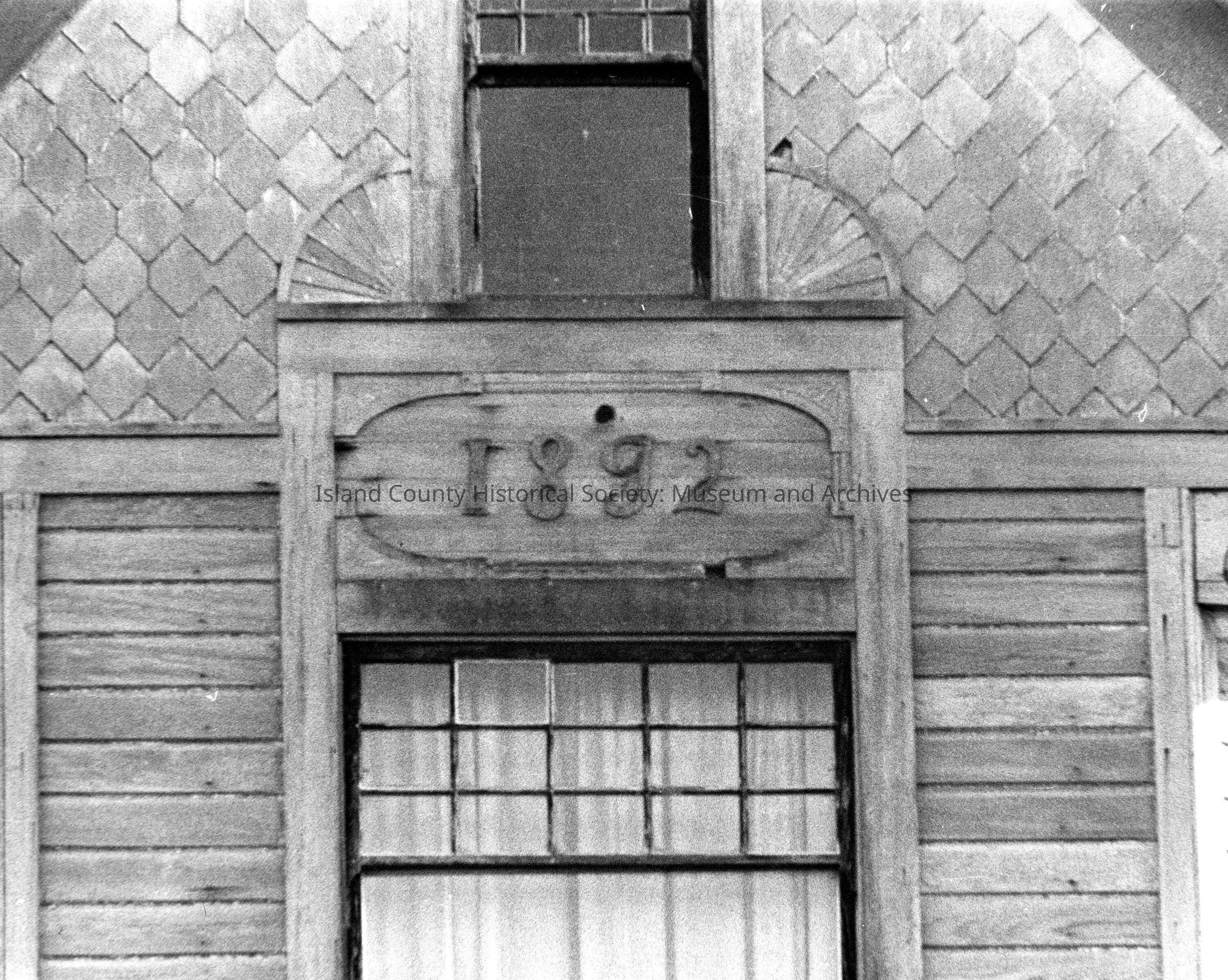 b/w Date (1892) and decorations on upper window of the LeSourd House