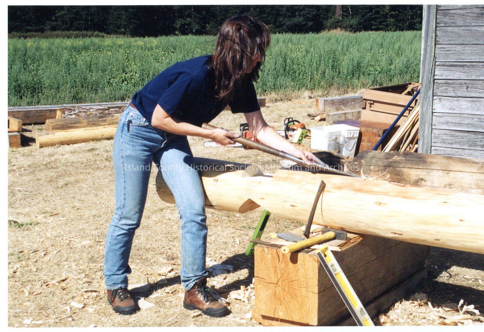 Jacob Ebey Blockhouse restoration in 2002 Woman woodworking outside in front of the Ebey house