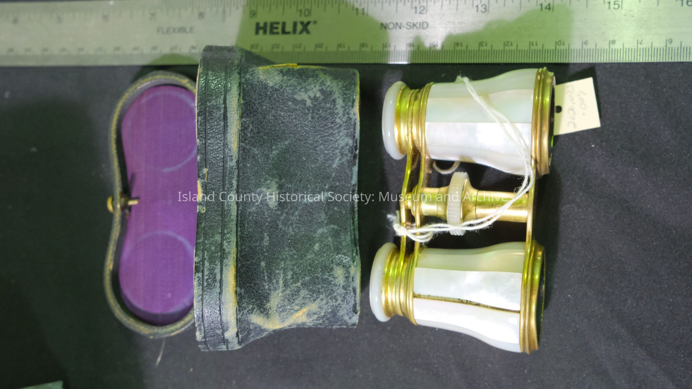 Opera glasses with case belonged to Jenne family. Mother of pearl surrounding lenses. A couple of the pieces have come off.
