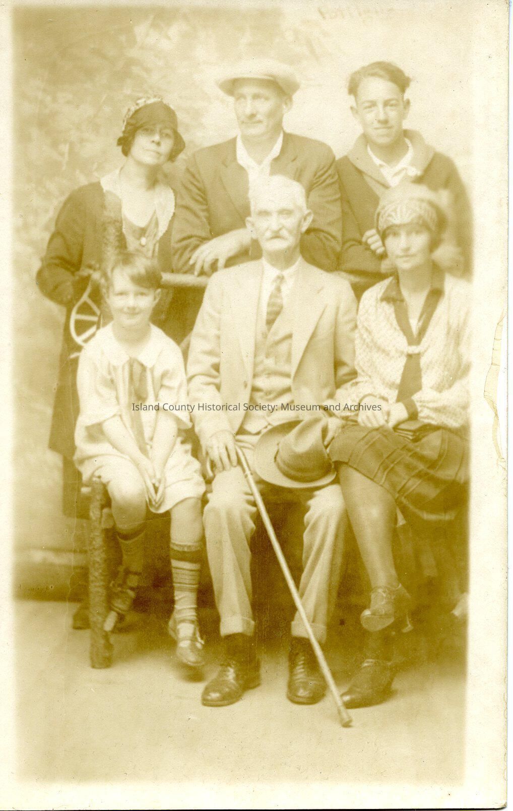 A black and white sepia toned postcard of 6 people. Standing are an adult woman in a hat, an adult man in a hat, and a second adult man with brown hair. Seated in front are a young child, an older man with a cane, and a woman in a hat. The back of the photo reads "1929 Pety Bill Rosemary Donald Marge Miller w/ Grandpa Harris"Collection