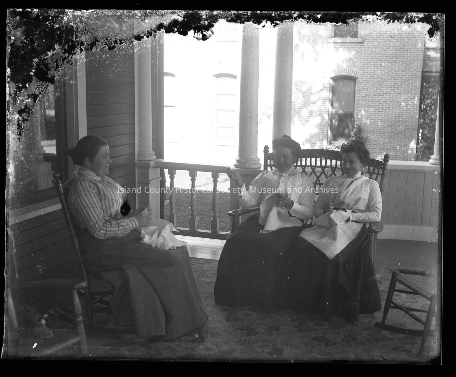 Three women in long dresses sitting on a porch embroidering (May be grandmother and granddaughters). Photo taken during daytime. Two of the women are sitting together on a bench. One woman is sitting on the left in a rocking chair. The woman on the left is wearing a striped shirt. There are two empty chairs on the porch. Sunlight is hitting the building next to the porch. There is deteriation of the photo, most significantly along the top of the picture.Made/Created