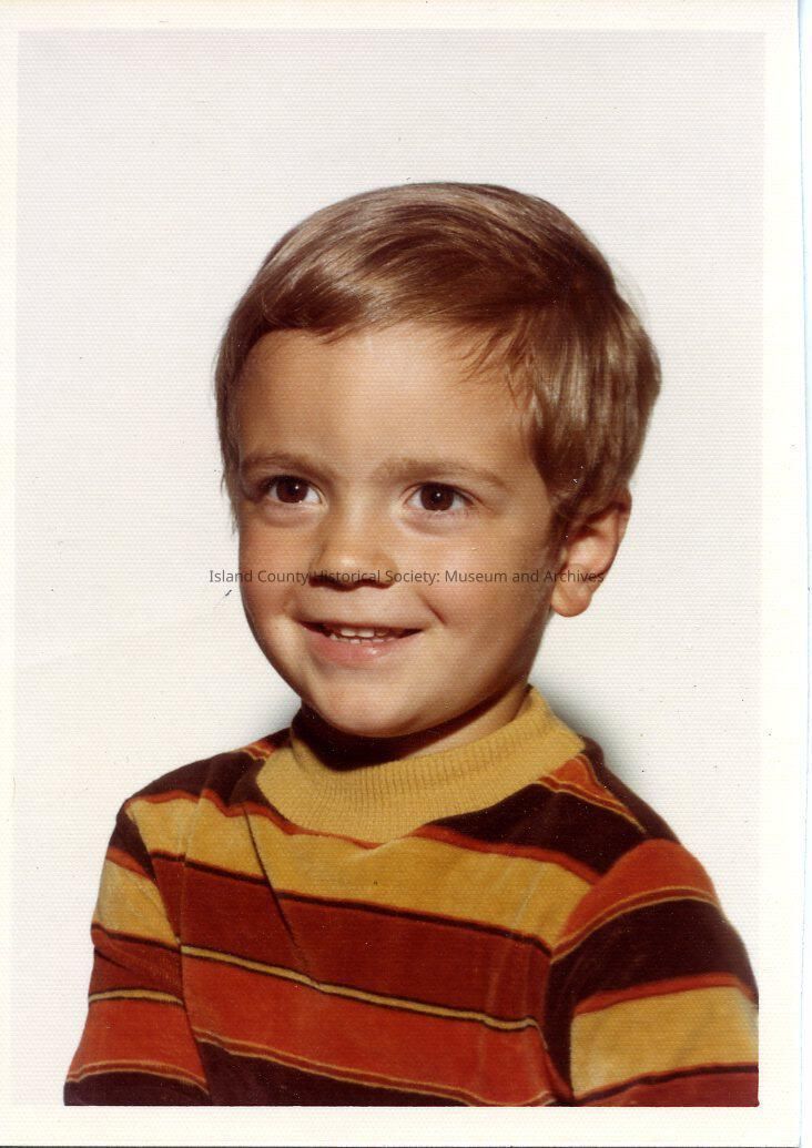 A color photo of a young boy with blond hair and a striped red and yellow shirt. The back of the photo reads "Bryan Rice Son of Nona, Betty Harris's Daughter. 3 1/2 yrs. 9-22-72"
