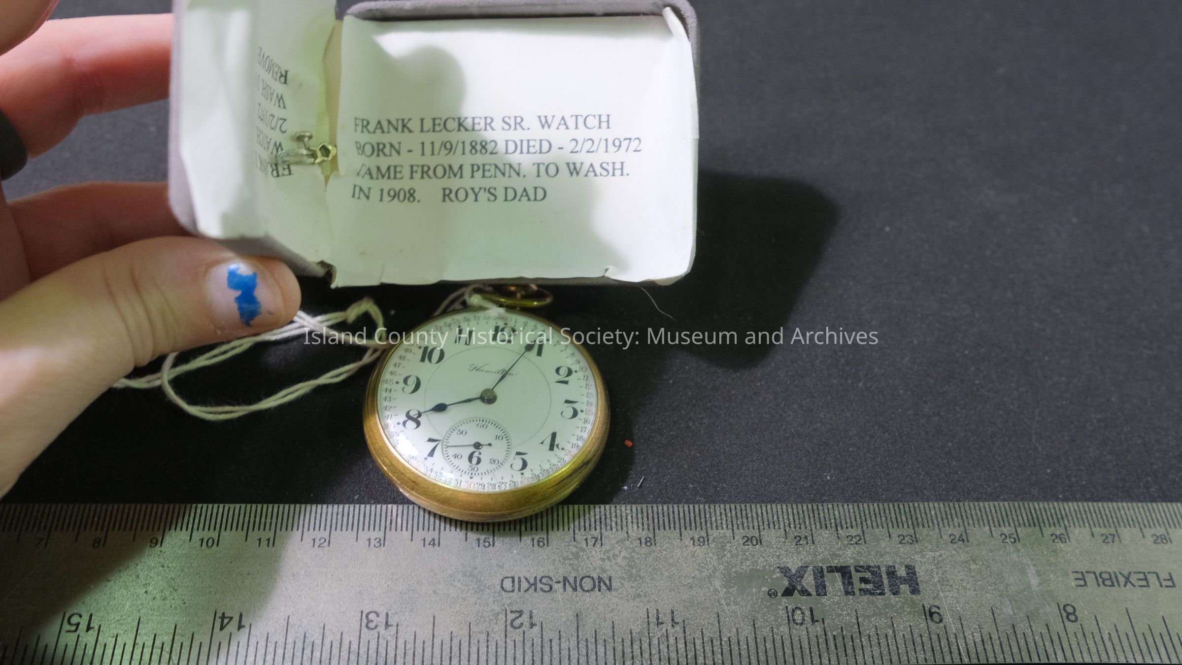 Hamilton pocket watch. belonged to the Jenne family Frank Lecker Sr. watch, born 11/9/1882, died 2/2/1972, came from PA to WA in 1908, Roy's dad