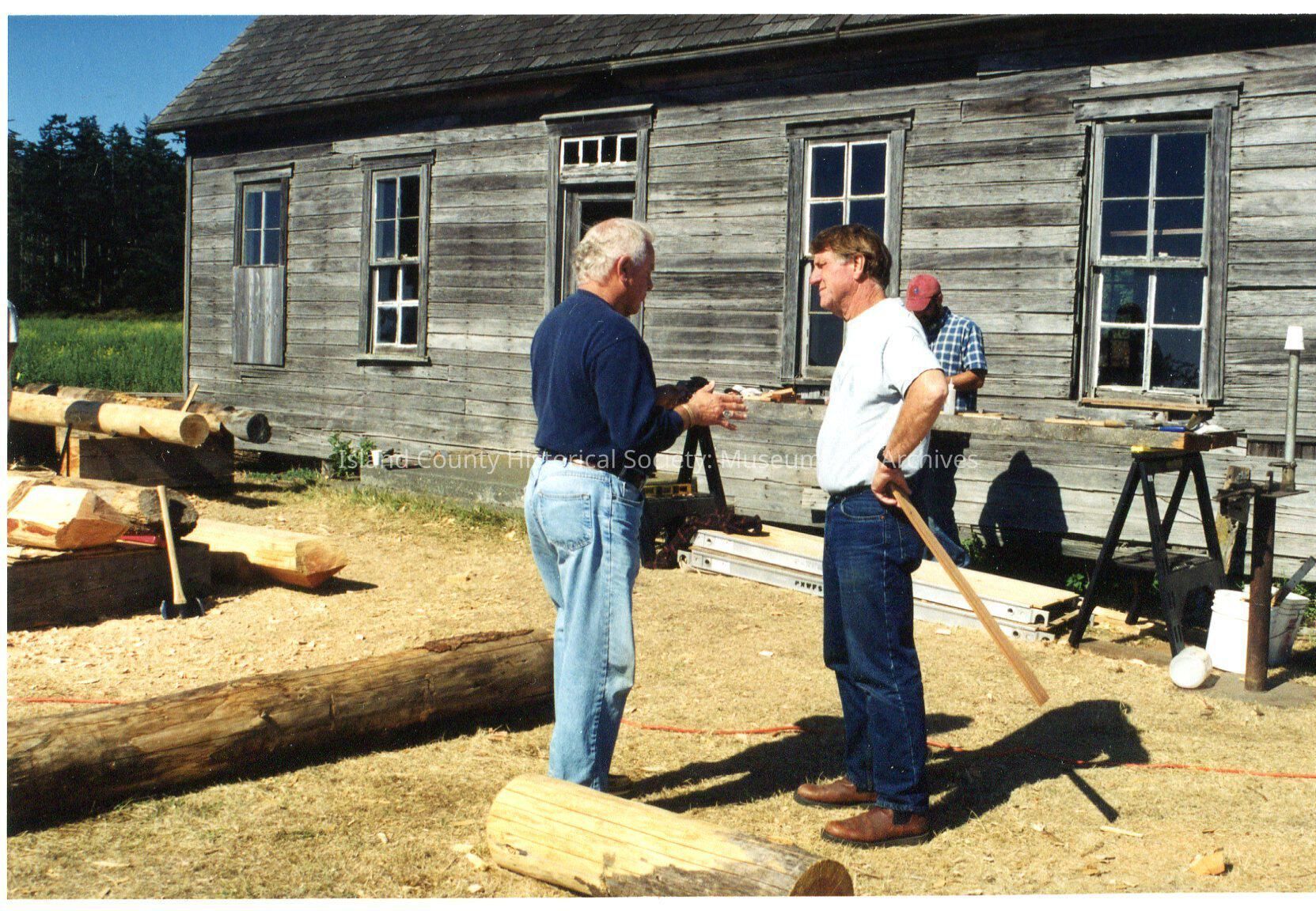 Jacob Ebey Blockhouse restoration in 2002 Two men talking whilst one man works on wood in the background. Logs- new and old- resting on blocks or on the ground. Outside the Ebey house.