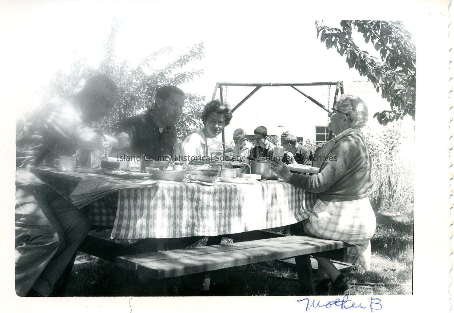 A black and white photo with a scalloped edge of multiple people sitting at a picnic table with a gingham tablecloth on it. There are 4 men and 2 women. The back of the photo reads "Picnic".