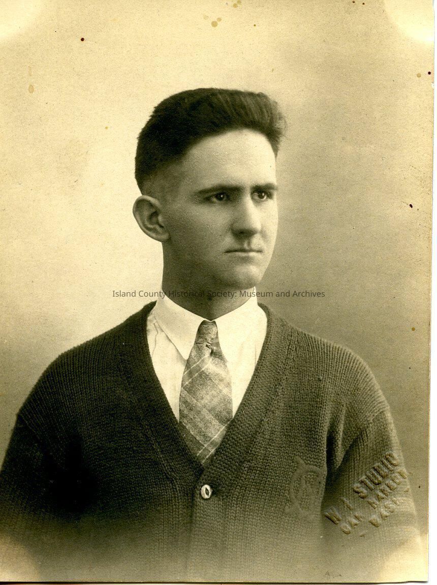 A black and white photo of a man looking to the right. He is wearing a button down shirt, tie, and cardigan. He has dark, short hair. The back of the photo reads "Mel Neil OHHS"Collection