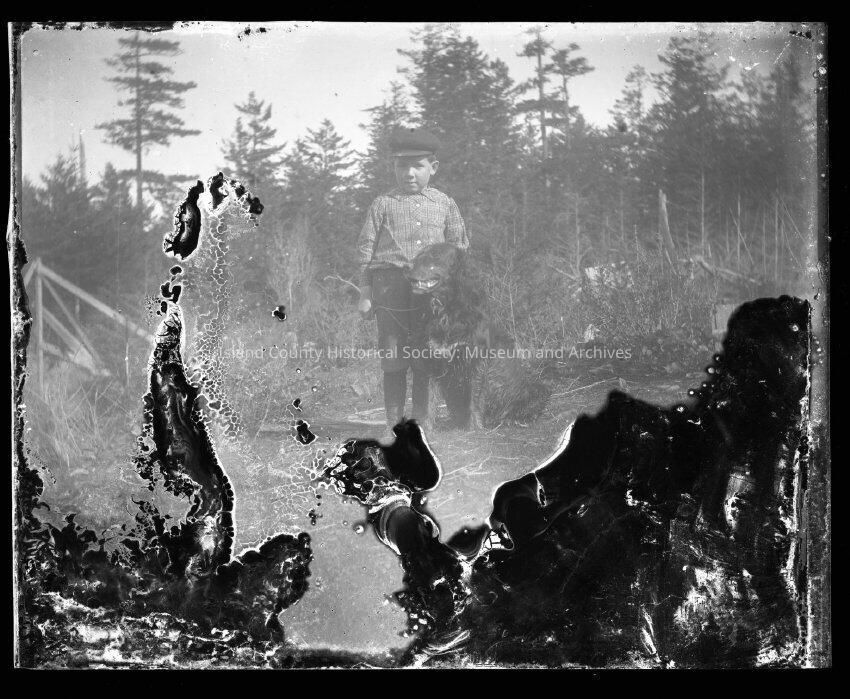 A boy and his dog in the woods(boy looks to be 8-10 years old). Boy is wearing a plaid button down shirt, hat , and long boots. The dog comes up to the boys torso. The boy has the dog on a leash. There is a broken fence in the background as well as vast amounts of trees.The picture is taken during the day. The photo is heavily corroded along the bottom and it is moving its way up the photo.Made/Created