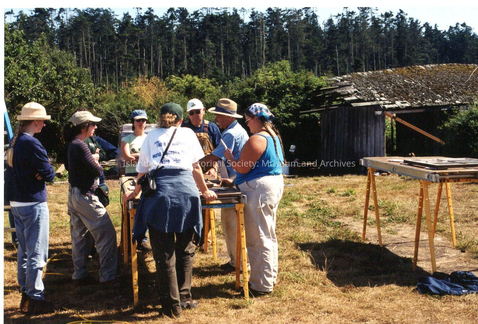 Albert Heath Gathering September 5th 2002 out on Ebey's Prairie. Group of men and women standing around a construction bench not far from the Ebey house stables and outhouse. Clustered around bench on left side of photo. Another workbench on the right side of photo. They appear to be watching a demonstration by a man with hat and white moustache.