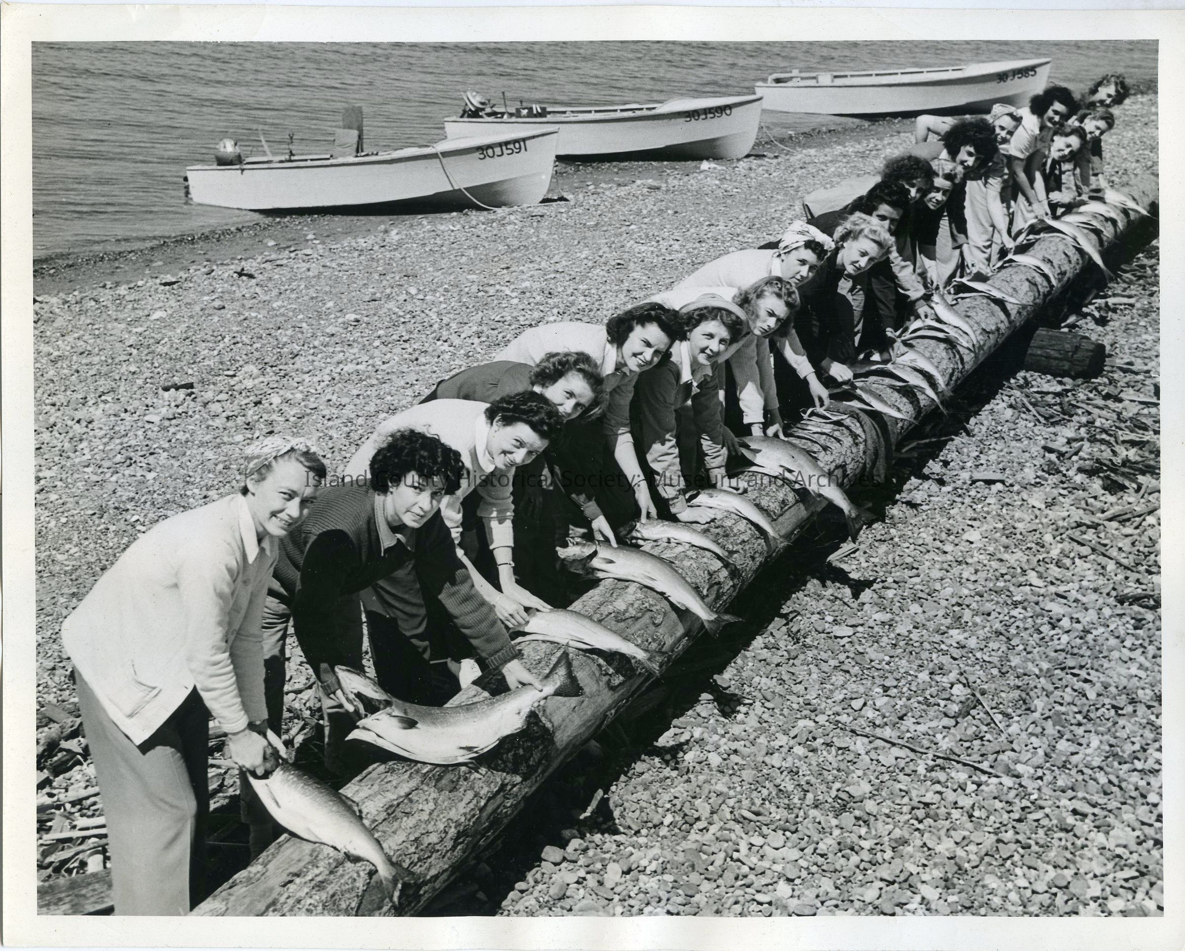 Women from WACS, WAVES, and SPARS stationed in Seattle, guests of Seattle Poggie Club for a day of fishing at Whidbey Island. The women are displaying their Silver and Chinook salmon catch, 1943.Photograph Details