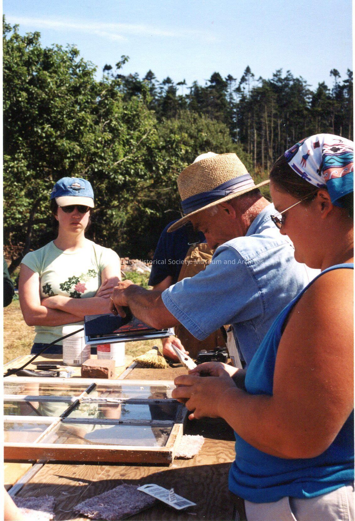 Albert Heath Gathering September 5th 2002 out on Ebey's Prairie. Four people (a couple only partial views) watch a man working on a window pane on a workbench. One girl has her arms folded. One woman wears a blue top and bandana. Man wears hat and blue shirt. Trees in the background.