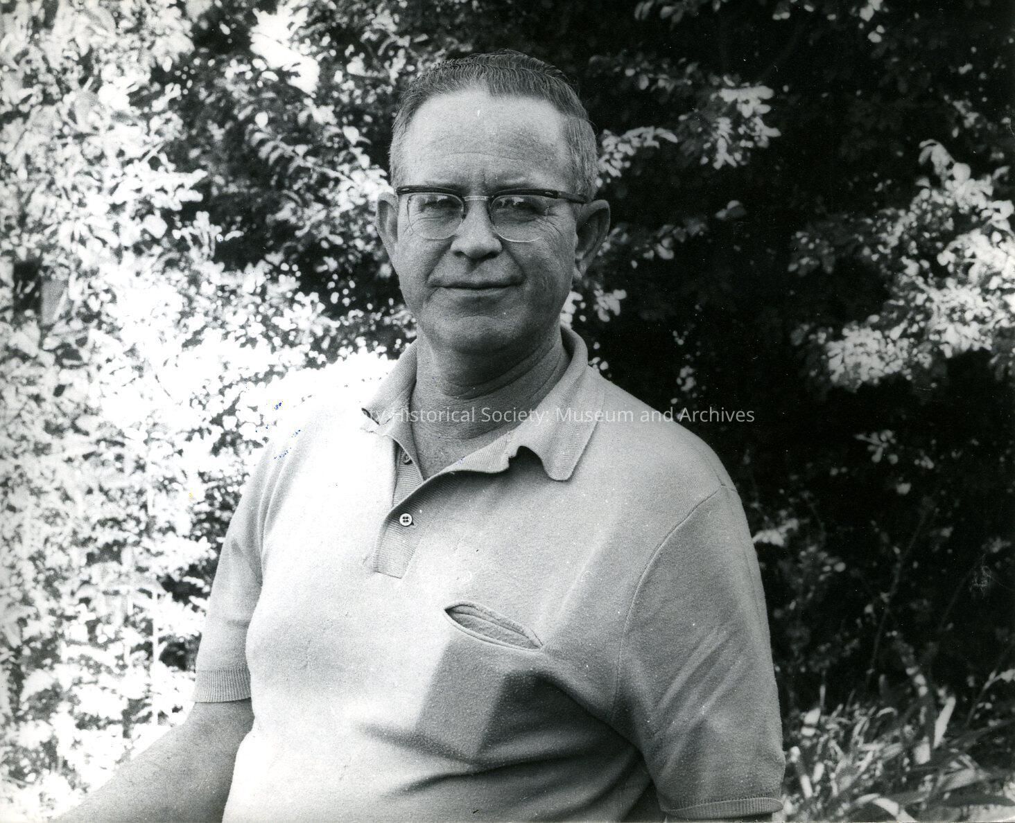 A black and white photo of a man wearing a polo shirt and glasses. The back of the photo reads "Tom Burrier".
