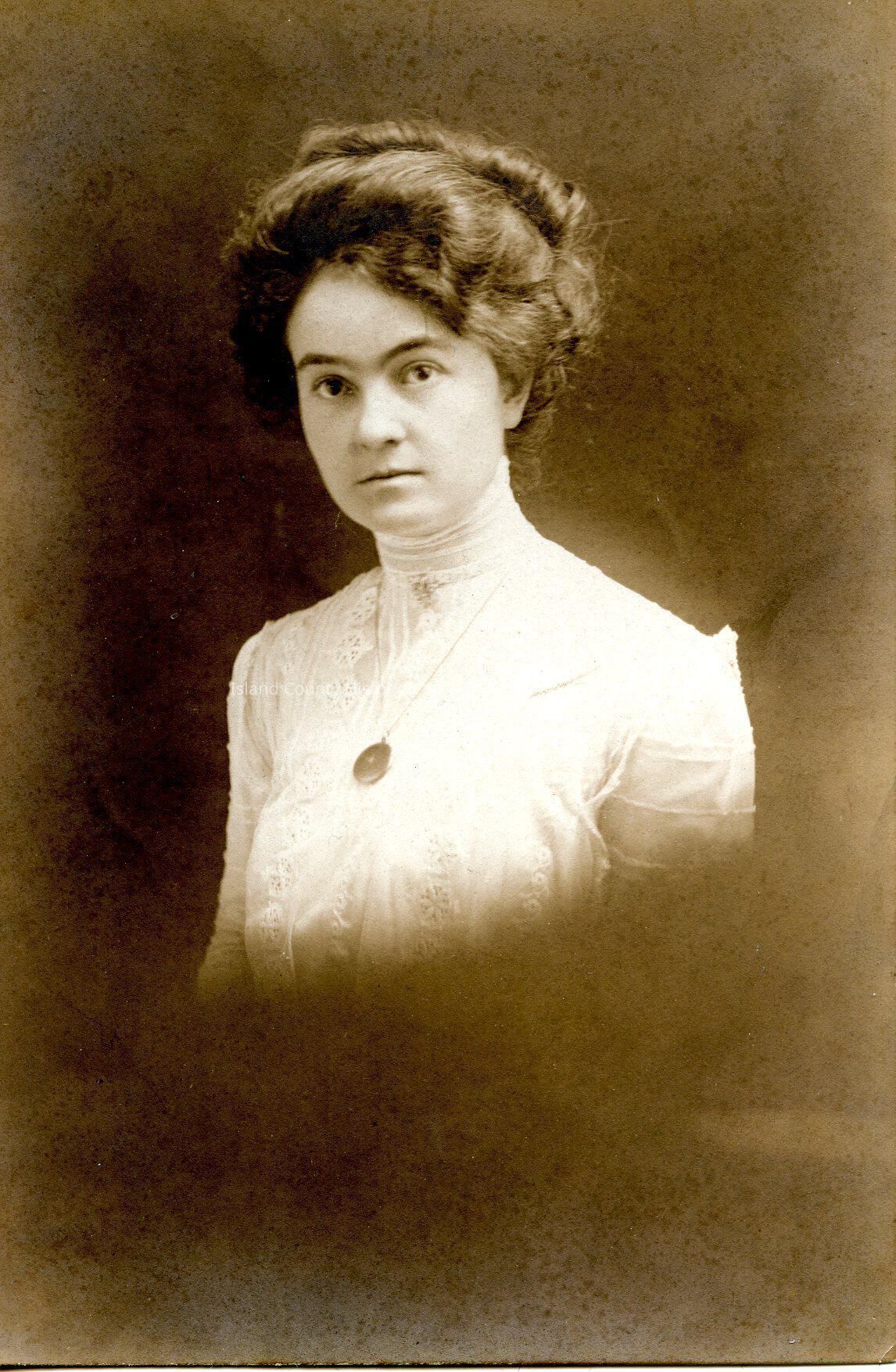 A black and white photo of a woman wearing a white, high neck victorian dress and a locket. Her dark hair is in an updo on top of her head. The back of the photo reads "Gracie Harris"