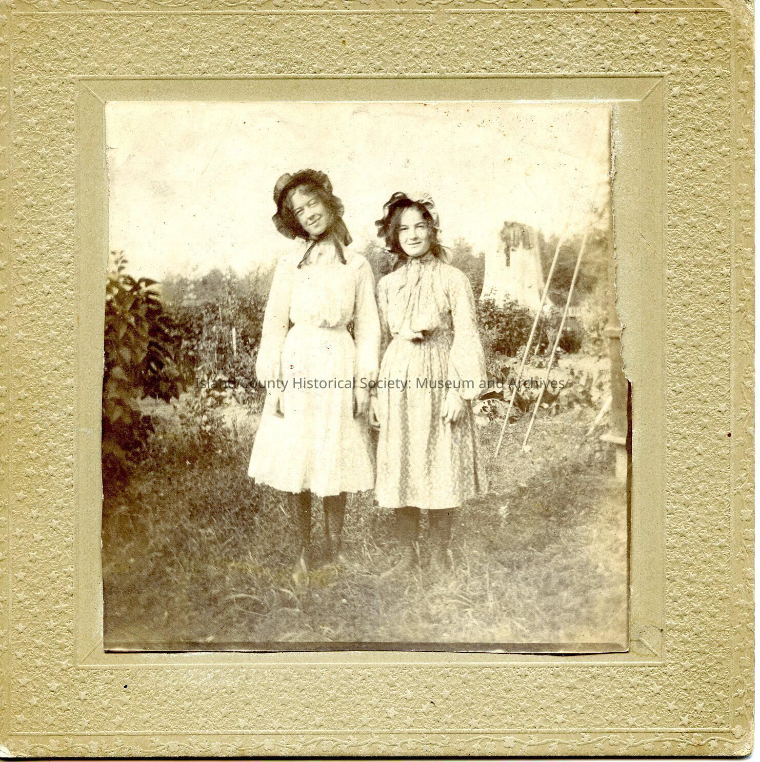 A black and white photo of two women standing next to each other in a field wearing dresses and bonnets. The back of the photo reads "Gracie and Marge Harris 1902"Collection