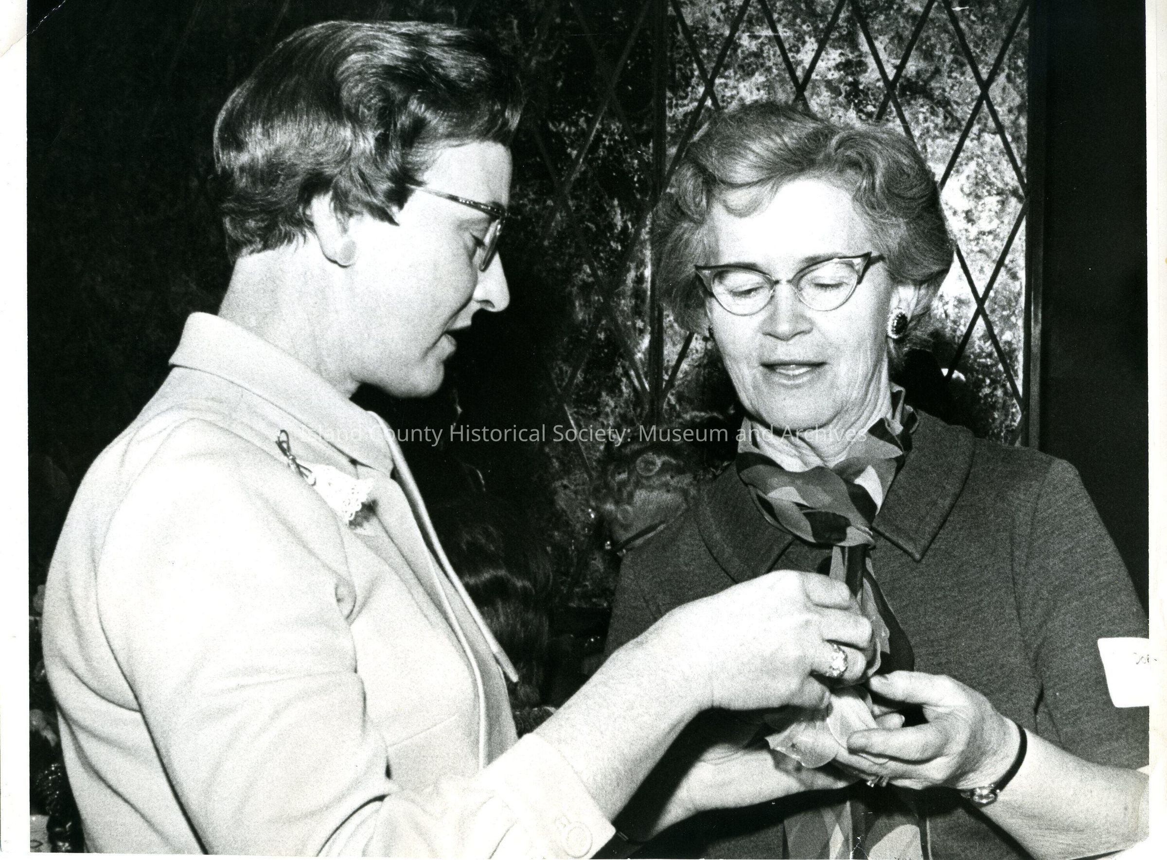 A black and white photo of two older women with short hair, both wearing cat eye style glasses. The back of the photo reads "Dec 1968 , Lettie Gudmestad Press Wash Press women "sugar plum" award to Dorothy Neil.Collection