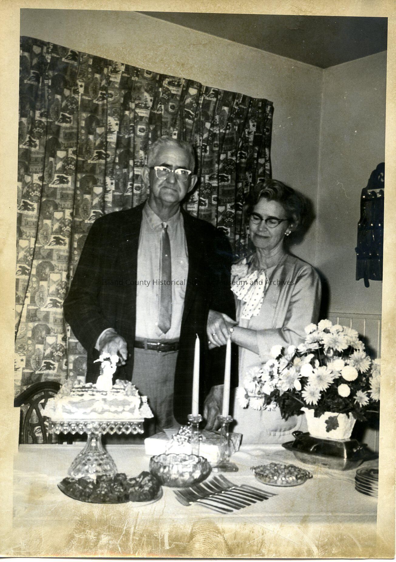 A black and white photo of an older adult couple. They are standing arm in arm next to a table with a cake, flowers, and candles on it. The back of the photo reads "Our 40th Anniversary. Mel and Dorothy Neil"Collection
